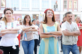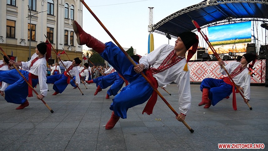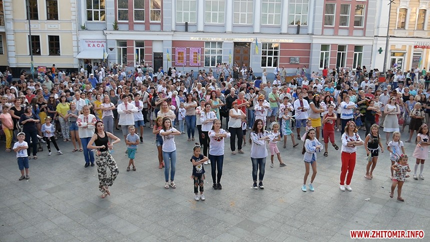 Кілька десятків житомирян долучились до спільного виконання українського танцю «Гопак» після того, як написали диктант про Житомир і помолилися за Україну.