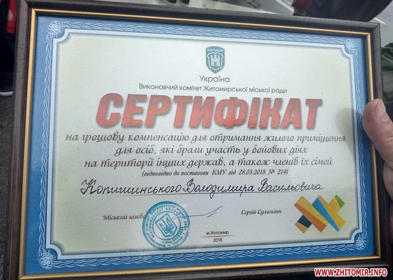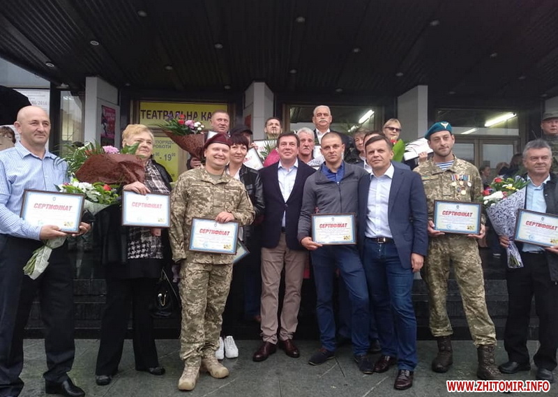 8 вересня у Житомирі на майдані Соборному воїнам-інтернаціоналістам та АТОшникам вручили сертифікати на грошову компенсацію для отримання житла.
