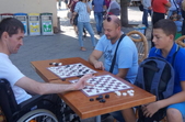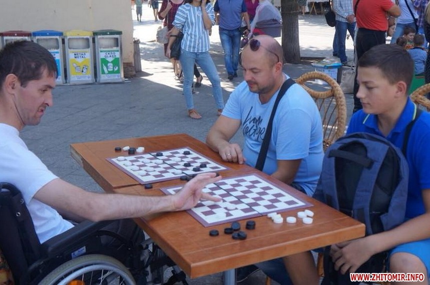 Шаховий майстер-клас просто неба провів інструктор штатної збірної команди України серед спортсменів з інвалідністю Олександр Гонгальський. У Олександра ДЦП, а ще він чемпіон світу з шашок серед людей з порушеннями УОРА (Болгарія) і депутат Корольовської райради м. Житомира.