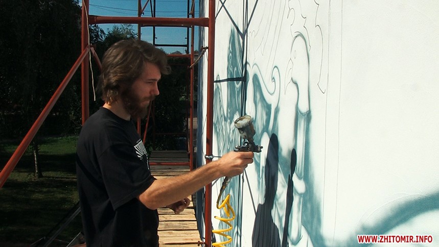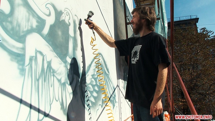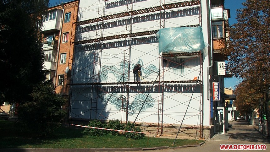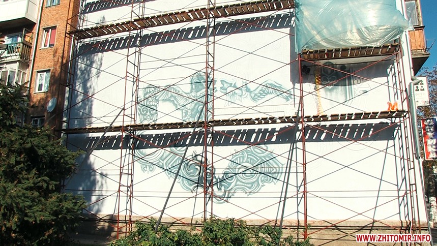 Житомирський художник Дмитро Краб розпочав роботу над картиною «Трисвіт». Малюнок з’являється на стіні будинку на вулиці Покровській. Кілька днів тому на утеплений фасад будинку нанесли контури майбутньої картини, і тепер Дмитро наносить фарбу на стіну. 20 вересня художник розповідає: працює тут щодня із самого ранку.