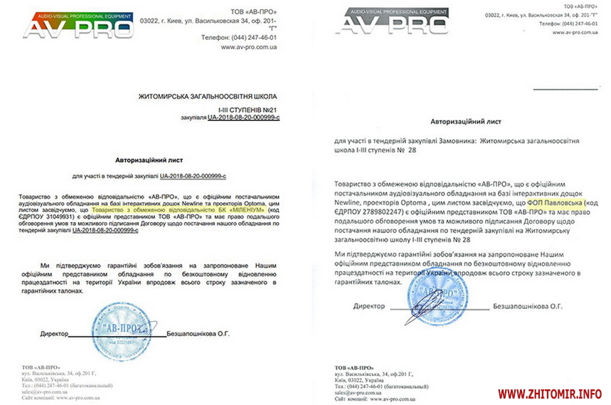 Офіційний постачальник мультмедійного обладнання, ТОВ “АВ-ПРО”, надає обом учасникам довідки про те, що вони є його офіційними представниками: