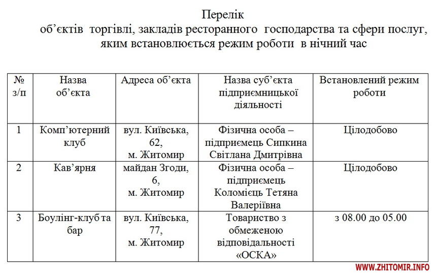 «Виконавчий комітет міської ради вирішив встановити режим роботи об’єктів торгівлі, закладів ресторанного господарства та сфери послуг в нічний час на території м. Житомира згідно з додатком», – йдеться у проекті рішення виконкому.