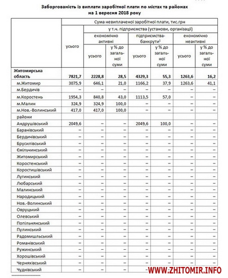 Як повідомляв Житомир.info, на 1 серпня 2018 р. загальна сума заборгованості з виплати заробітної плати у Житомирській області становила 7,7 млн грн, з неї 2,1 млн грн припадало на економічно активні підприємства.