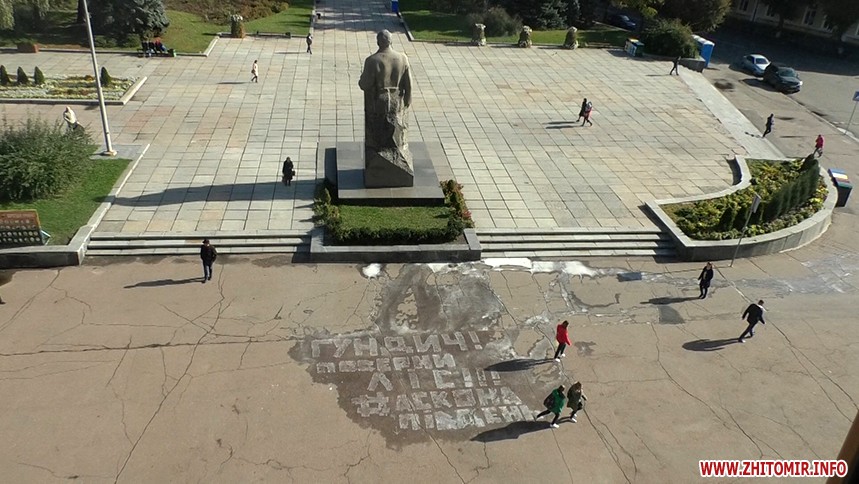 Поки губернатор Житомирської області Ігор Гундич 5 жовтня перебуває з робочим візитом у Бердичеві, на асфальті перед ОДА з’явився надпис – «Гундич поверни ліс».