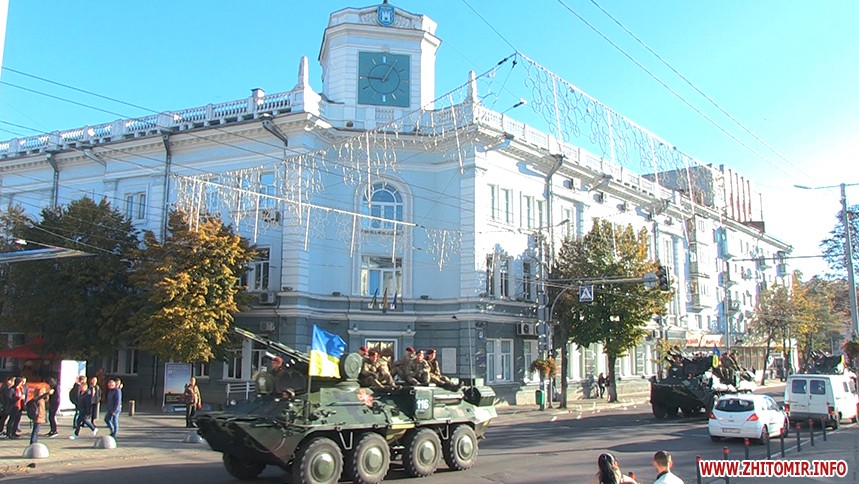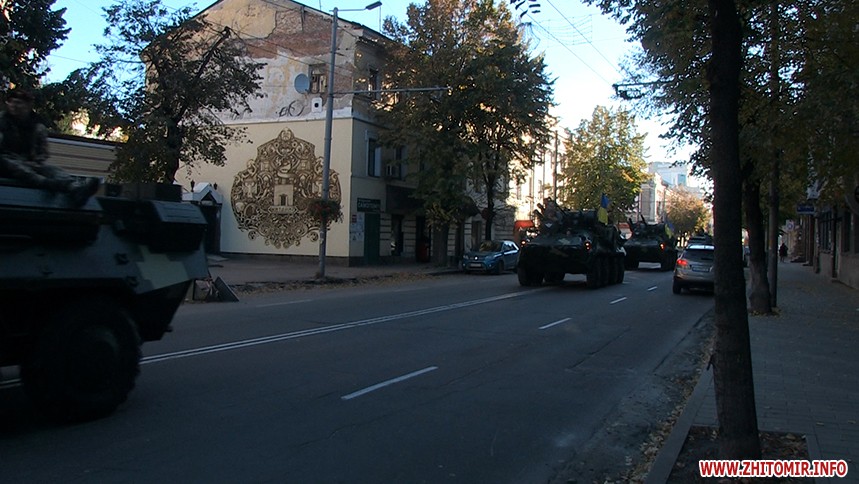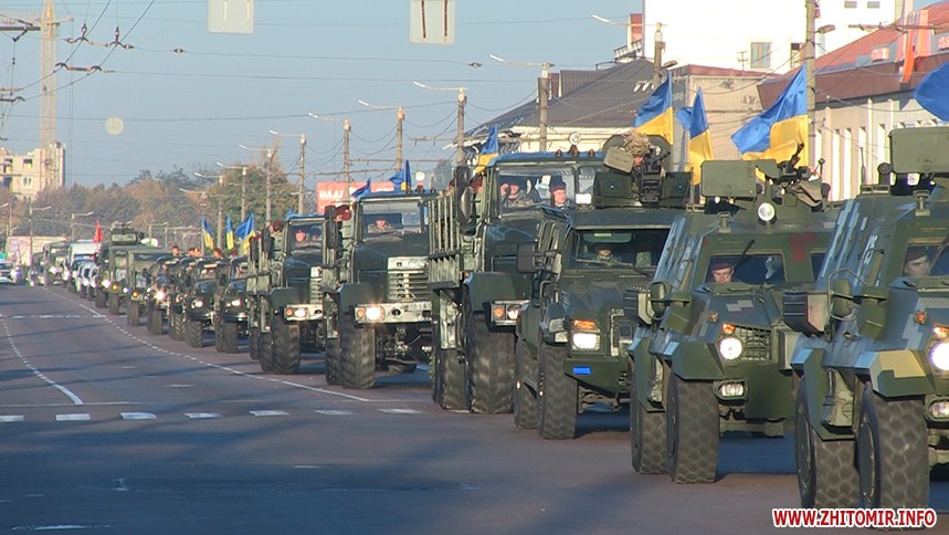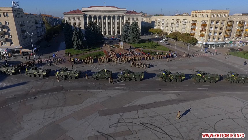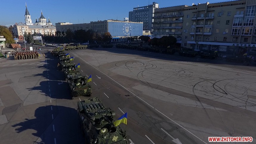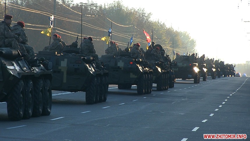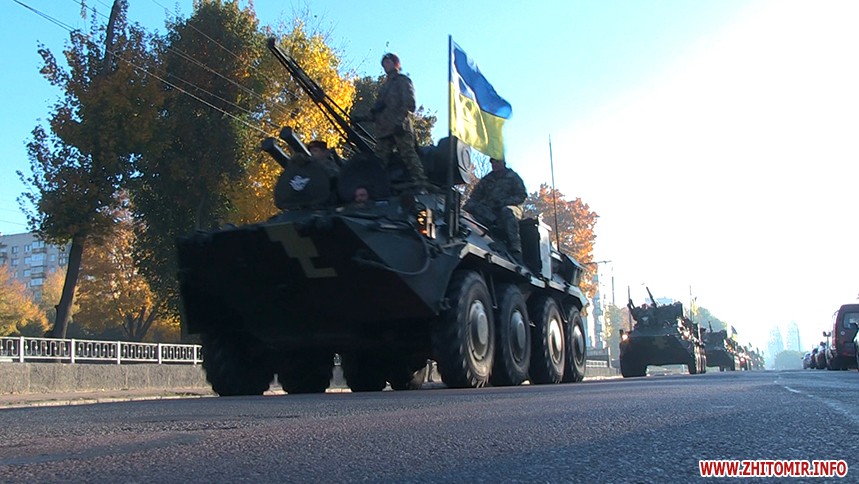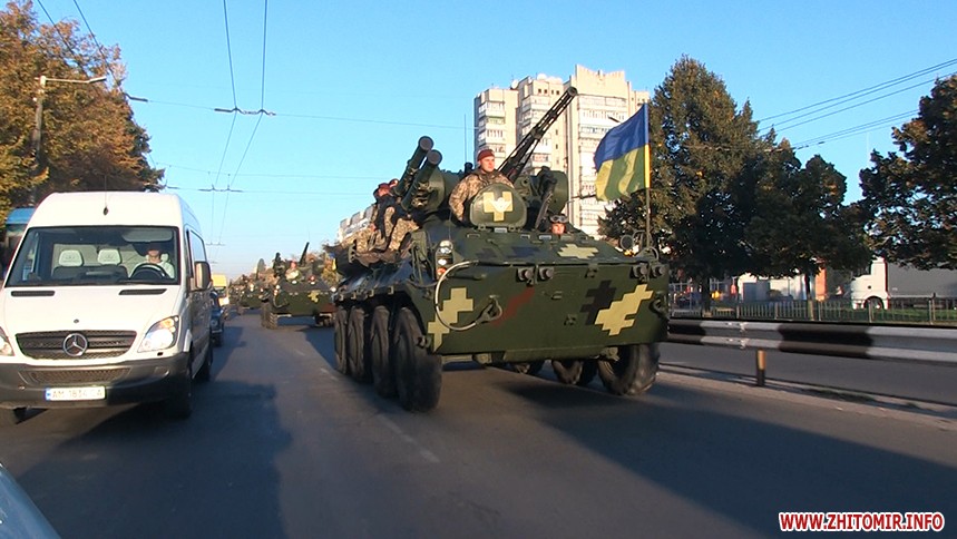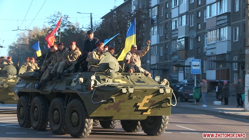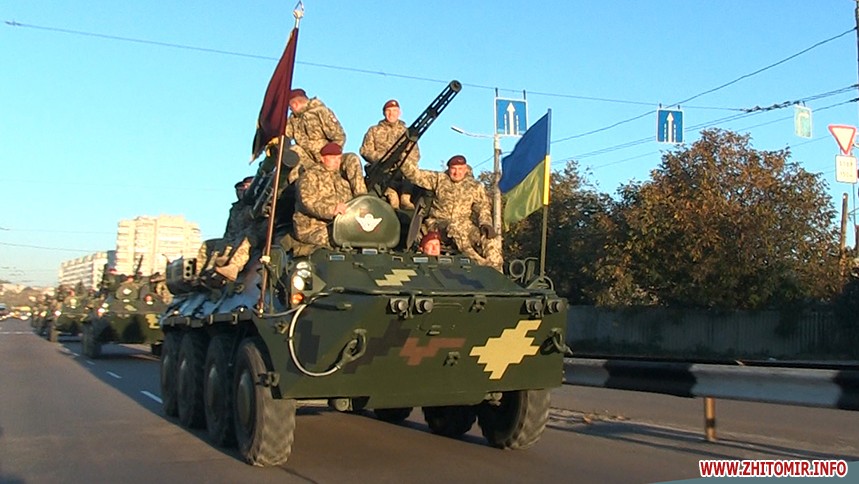 Сотні військовослужбовців, кілька десятків одиниць бронетехніки та українські прапори – 13 жовтня військові частини Десантно-штурмових військ відзначили День Захисника України маршем вулицями Житомира та нагородженням військових на майдані Соборному.