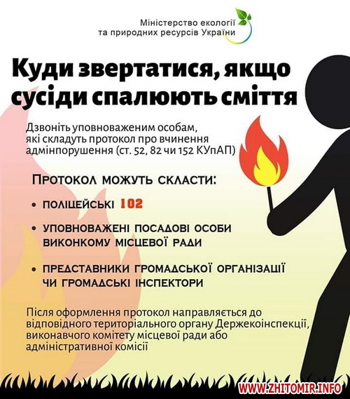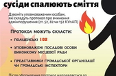 Спалювання всіх видів відходів на території домоволодінь і в сміттєзбірниках суворо заборонено законом (Кодекс України про адміністративні правопорушення). Поскаржитися можна: до поліції за номером 102, посадовців виконкомів, представників громадських організацій та громадськх інспекторів Держекоінспекції.