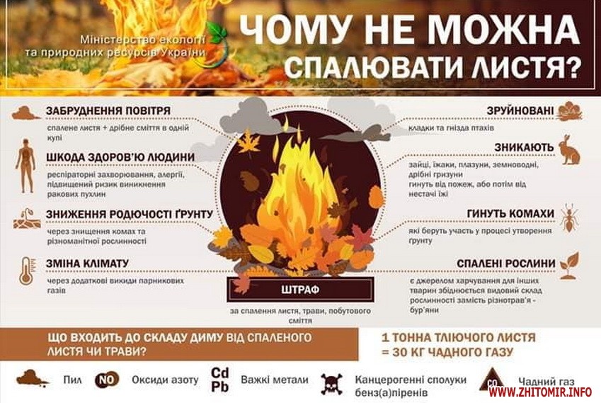«Спалювання рослинних залишків становить суттєву загрозу природі: з листям згорають зимуючі корисні комахи, руйнується ґрунтовий покрив, відбувається збіднення ґрунту; знищується насіння і коріння трав’янистих рослин; пошкоджуються нижні частини дерев і кущів та верхні частини їхнього коріння; у 2-4 рази зростає промерзання ґрунту», - інформує ОДА.