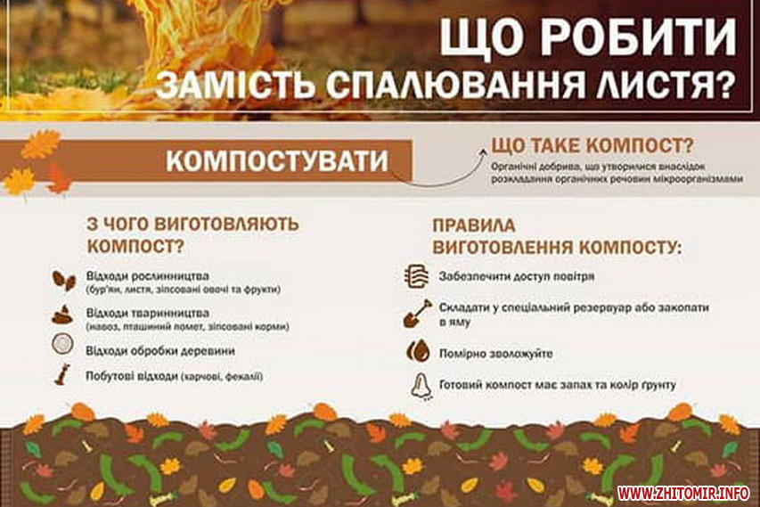 Краще не палити листя, а перетворювати його на компост – природне добриво. Це і корисно для довкілля, і цілком безпечно для здоров’я. Для створення компосту листя складають у невеличкі купи – шириною у два метри. Також їх можна просто розстелити рівним шаром на городі та перекопати землю.