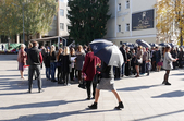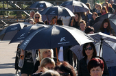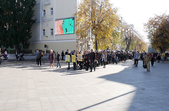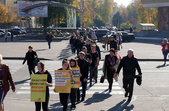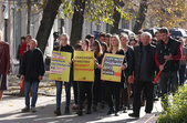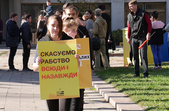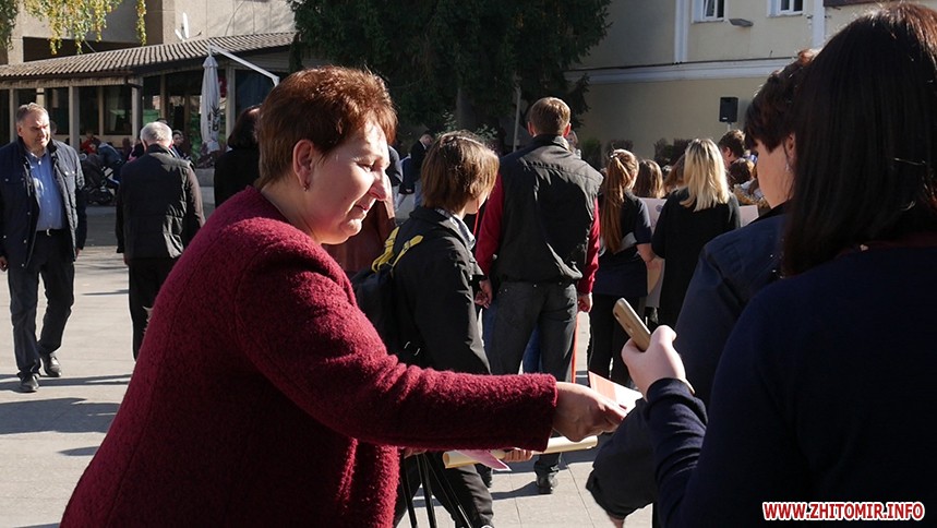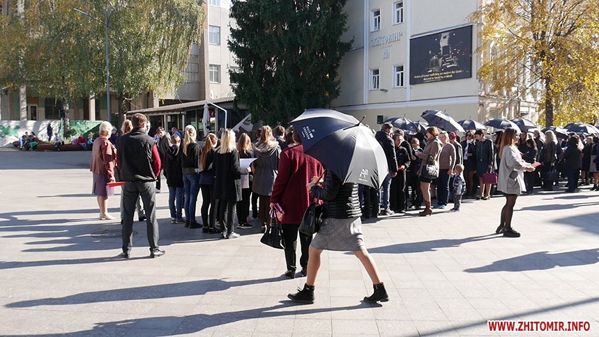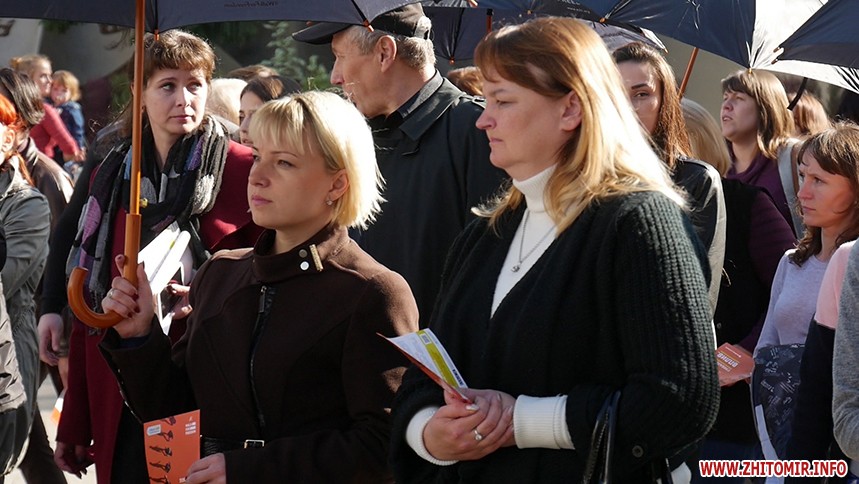 «По всій Україні 18 жовтня відбуваються заходи, щоб привернути увагу суспільства до такого ганебного явища, як торгівля людьми. Більшість з нас у темних костюмах, ми мирною ходою хочемо привернути увагу суспільства, щоб були обережними. Обережними при працевлаштуванні, при виборі роботодавця, у тому числі і за кордоном. 27 людей мають статус потерпілих від торгівлі людьми (в Житомирській області, ред.), по Україні близько 230 тисяч», - розповідає директор департаменту праці, соціальної та сімейної політики Житомирської ОДА Юрій Прокопець.