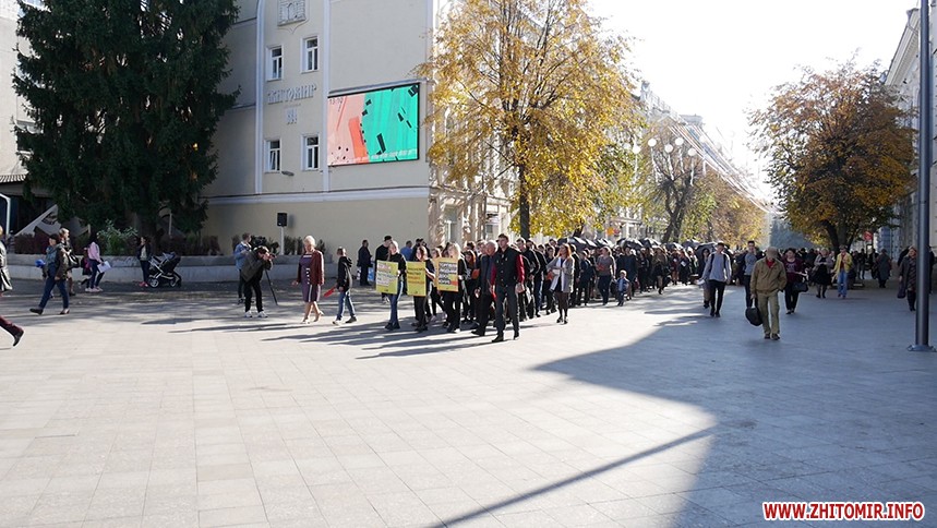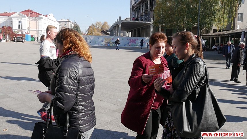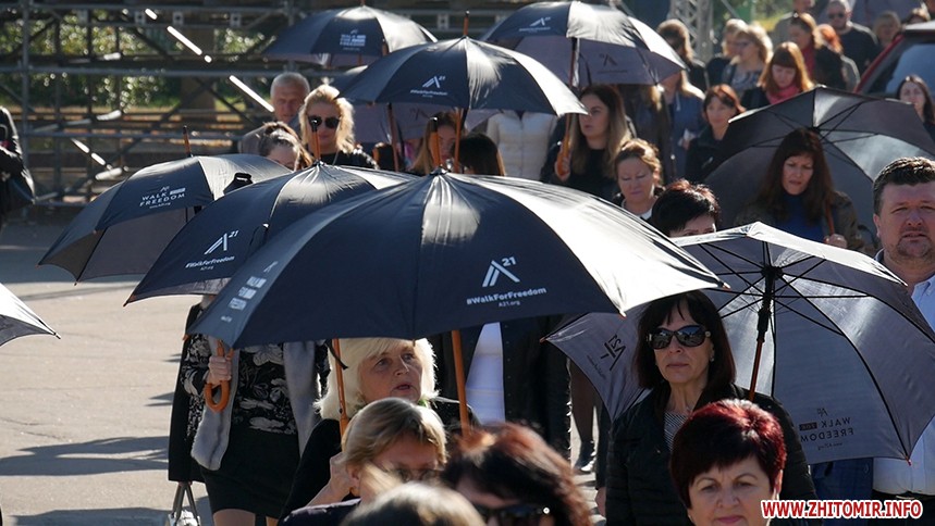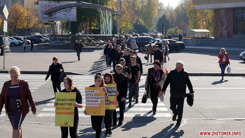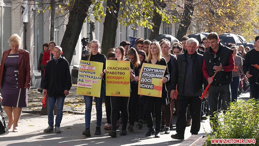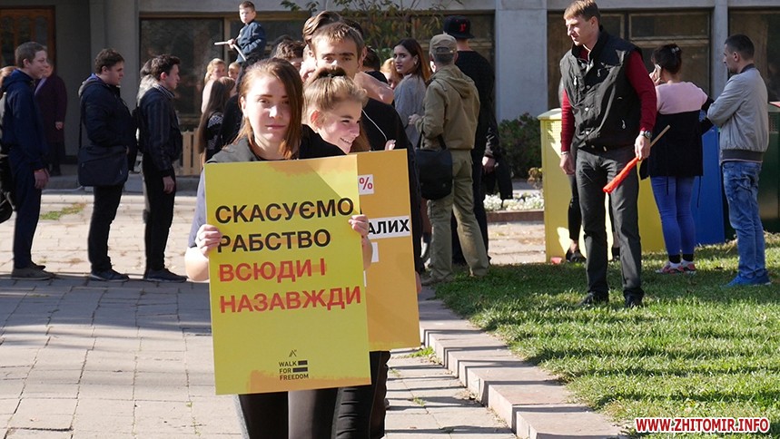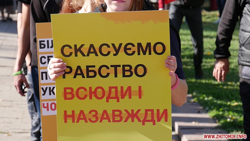 У Житомирі 18 жовтня більше сотні людей пройшлися мирною ходою проти торгівлі людьми. У руках тримали плакати із написами: «Скасувати рабство всюди і назавжди», «Торгівля людьми досі існує», закликаючи людей бути свідомими та обачними.