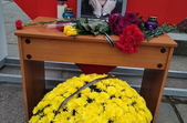Біля знімка з чорною стрічкою – лампадка і троянди.
