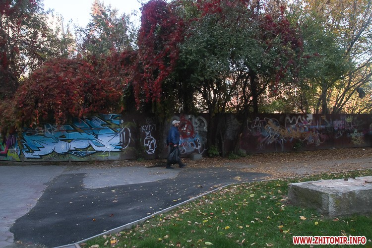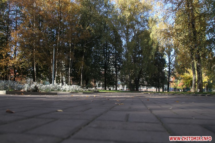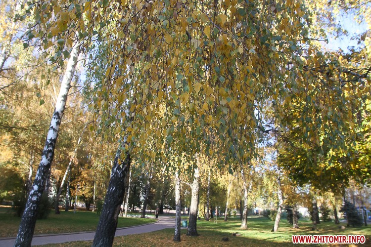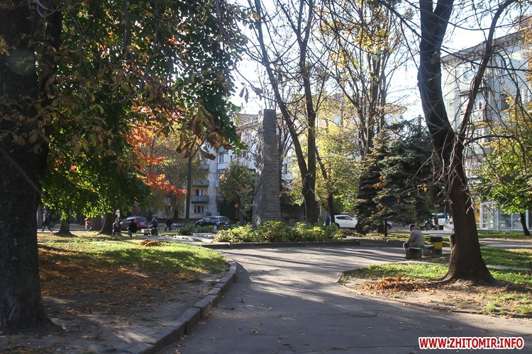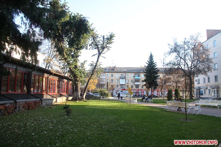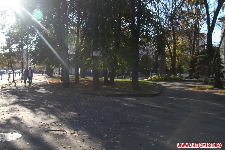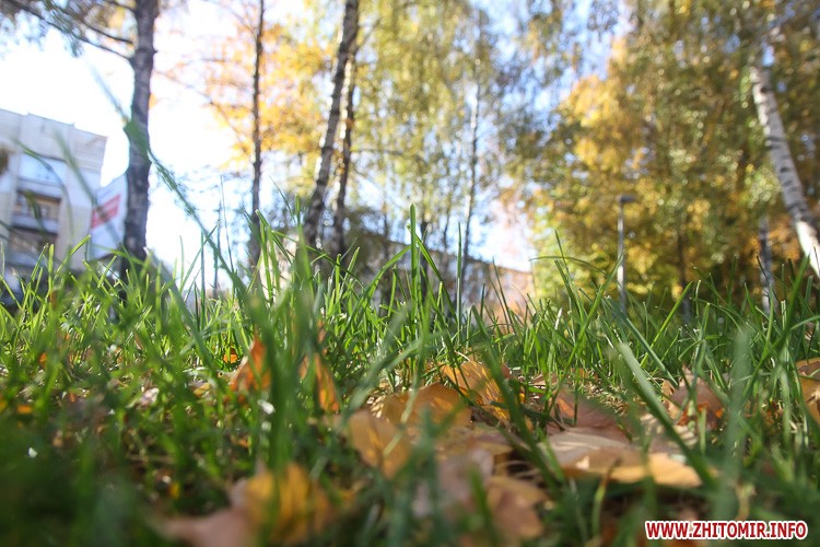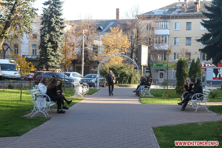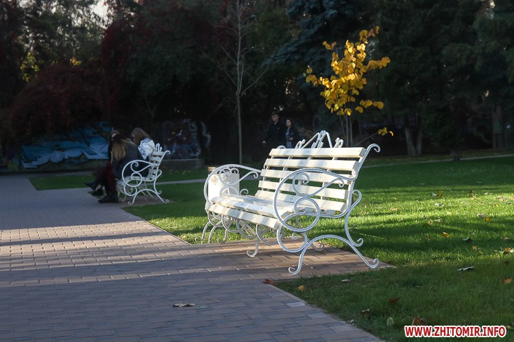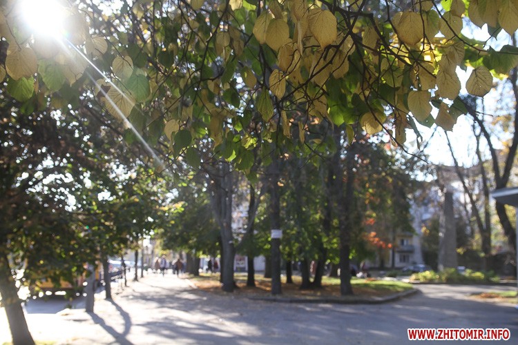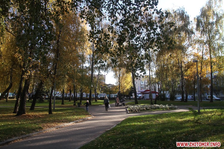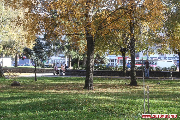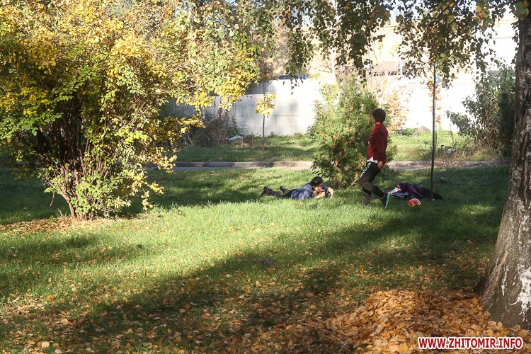 У будень тут малолюдно: лише поодинокі житомиряни прогулюються скверами, відпочивають на лавках, а дехто й приліг просто на траві, насолоджуючись ще теплими осінніми градусами.