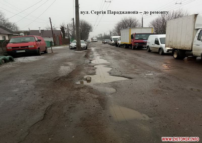 «На даний час розпочаті ремонтні роботи на вулиці Параджанова протяжністю 1,5 км ( від перехрестя шосе Київське – до вулиці Сергія Параджанова буд 64). Зараз на об'єкті працює підрядна компанія ALKE, яка на замовлення облдержадміністрації виконує капітальний ремонт даного відрізку дороги. Станом на сьогодні проводяться роботи щодо демонтажу борту, а найближчим часом буде розпочато роботи по заміні зливових мереж. Після цього компанія розпочне влаштування нових бордюрів та тротуарів. Паралельно будуть проводитися роботи з улаштування нижнього та вирівнюючого шарів асфальтобетонного покриття. Інженерні роботи та влаштування двох перших шарів покриття планують виконати в цьому році; верхній шар асфальту – вже навесні після сходження снігу», - розповідає Юрій Антіпов, радник Житомирського міського голови.