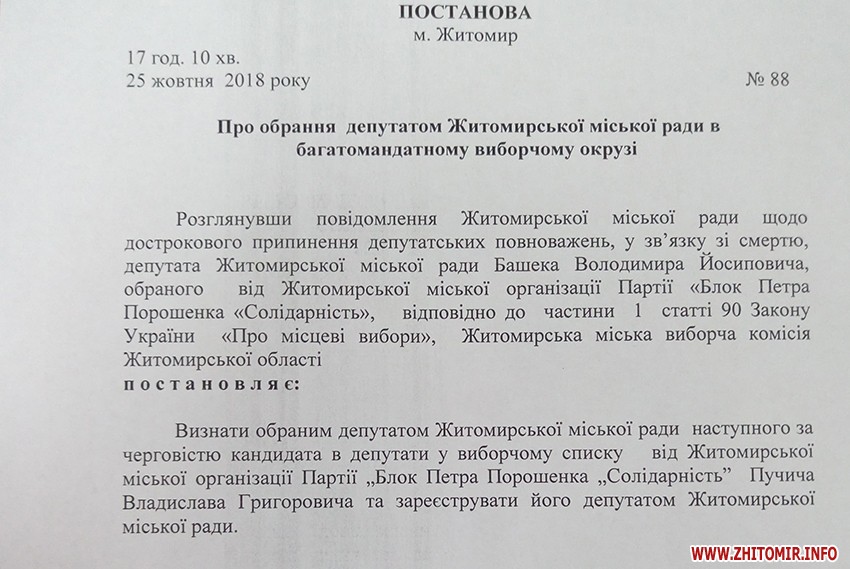 Згодом вона зачитала постанову комісії,у якій йдеться: «Визнати обраним депутатом Житомирської міської ради наступного за черговістю кандидата в депутати у виборчому списку від Житомирської міської організації Партії «Блок Петра Порошенка «Солідарність» Пучича Владислава Григоровича та зареєструвати його депутатом Житомирської міської ради».