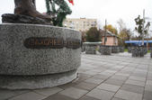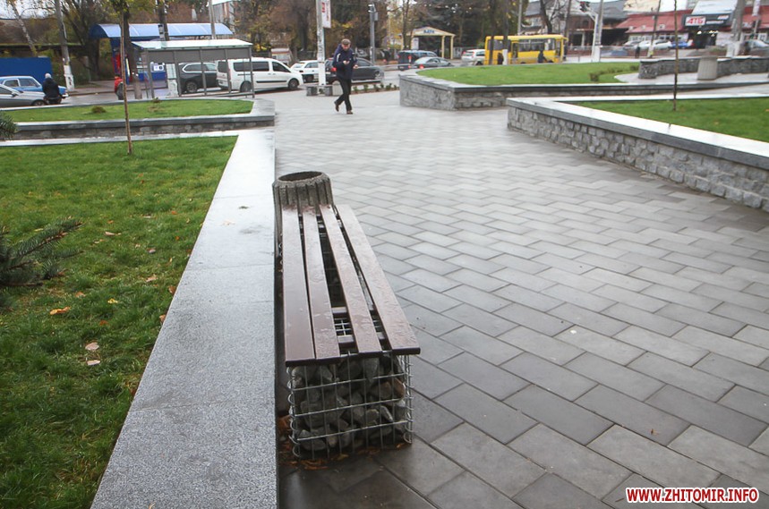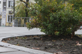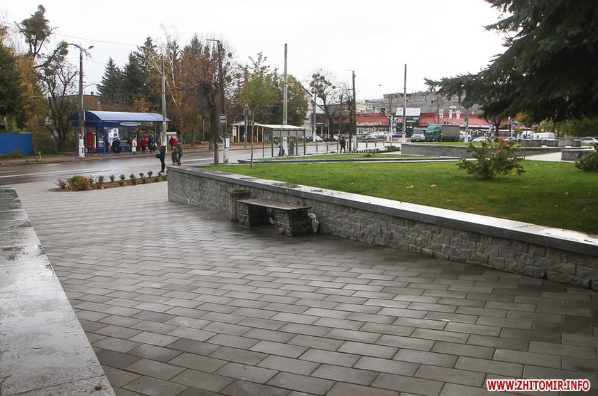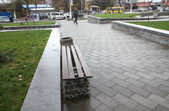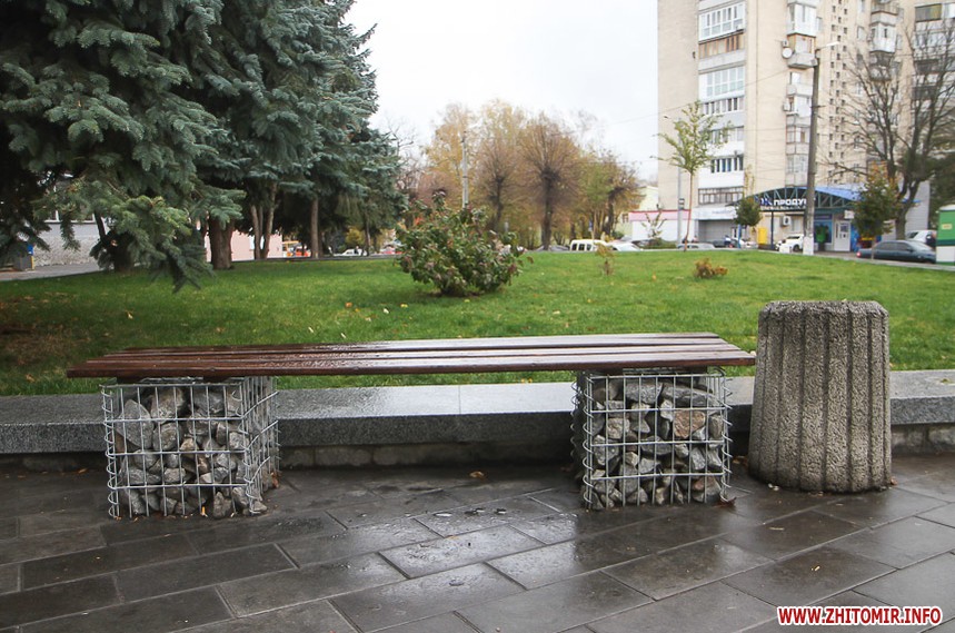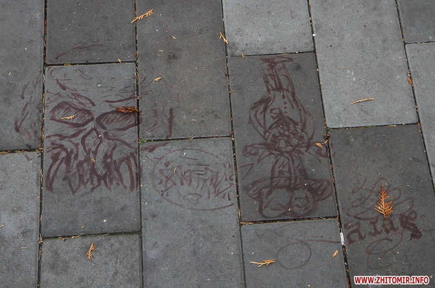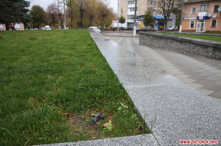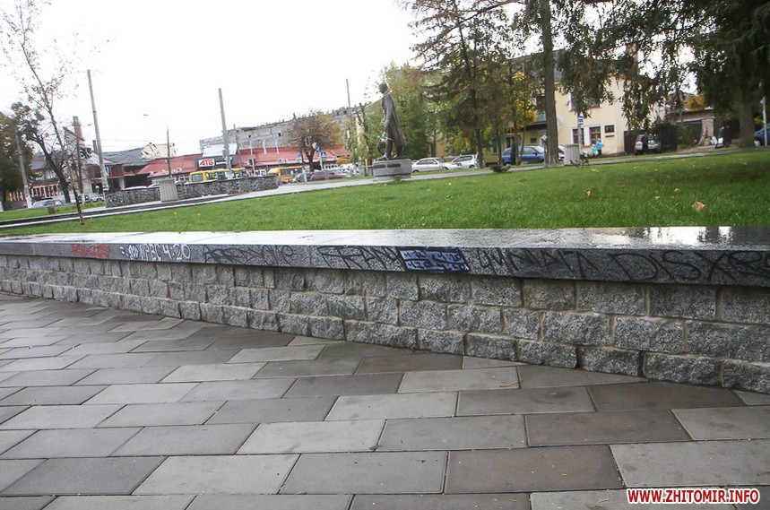 Цього дня біля бронзового Ольжича – вінок зі штучних квітів. Сквер майже не змінився: той самий газон, лавки з підніжками із дробленого каменю, декоративні кущі. З нового хіба що графіті на гранітному окантуванні і тротуарній плитці.