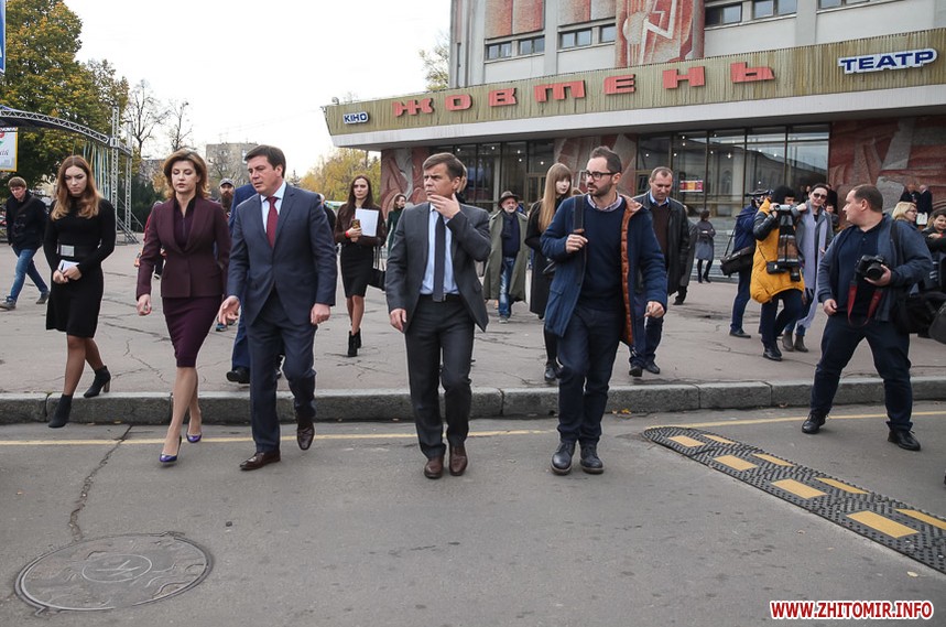 «Цей фестиваль став переможцем відбору Українського культурного фонду і як результат – отримав грантову підтримку як проект національного партнерства. Фестиваль має дуже оригінальну назву – «Жовтень у Жовтні». І хочу подякувати організаторам за неординарний підхід і креативне мислення. Сподіваюся, що саме з цього фестивалю розпочнеться відродження такої знакової для Житомира споруди, і «Жовтень» набуде нового сучасного змісту і стане центром прогресивних ідей», – сказала Марина Порошенко.