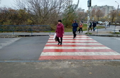 Станом на 2 листопада перехід трохи піднятий над проїжджою частиною, на ньому нанесена розмітка та облаштований водовідвід. Діти йдуть по ньому до шкіл, дорослі ведуть дітей до садочка.