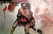 «Я працюю інтуїтивно і не планую заздалегідь, що буде на картині. Так як ми в Україні, я змішав кольори прапору - жовтий та синій. В результаті, вийшов зелений колір, колір миру. На противагу яскравому кольору, другу частину картини я розфарбував у чорним і якщо придивитися, то там проглядається силует людини. Якщо глядач побачить там обличчя, це послугує йому містком, щоб шукати образи в картині далі», - каже Бімасена Александр Гріем.