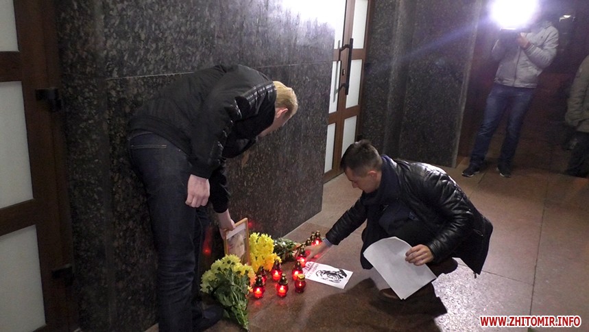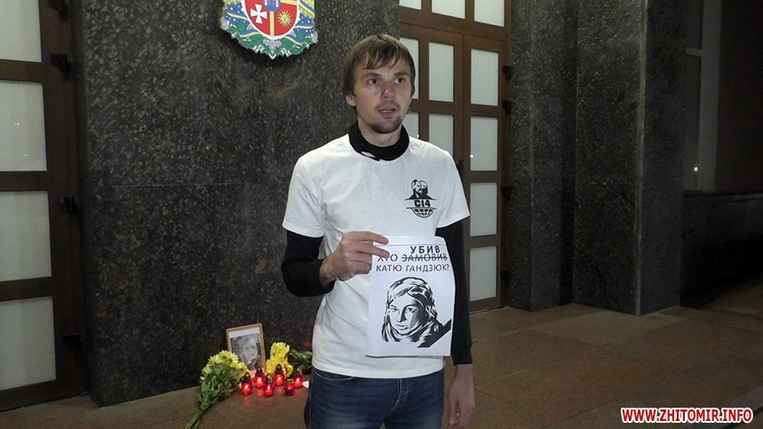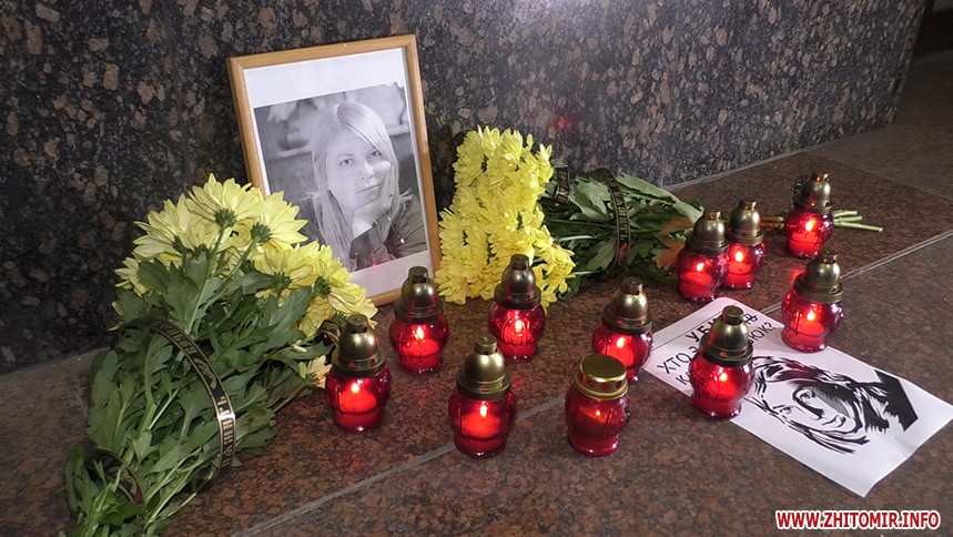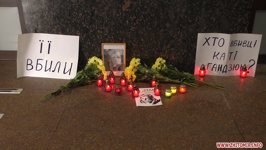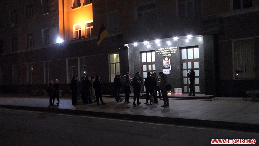 Ввечері 4 листопада під стінами головного управління Національної поліції в Житомирській області на Старому бульварі зібрались кілька десятків житомирян. Люди принесли з собою портрет радниці міського голови Херсона Катерини Гандзюк, яка померла сьогодні вранці в лікарні, квіти та лампадки.