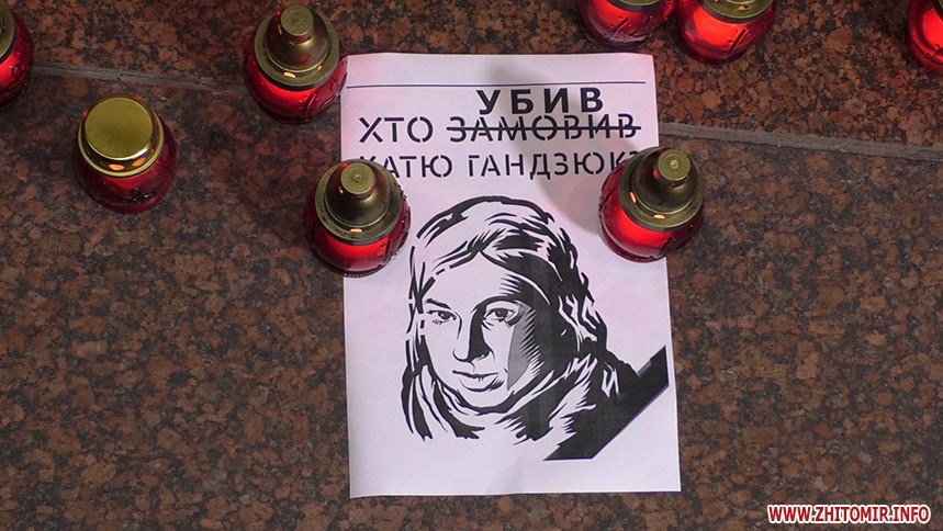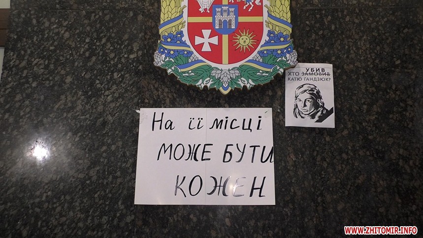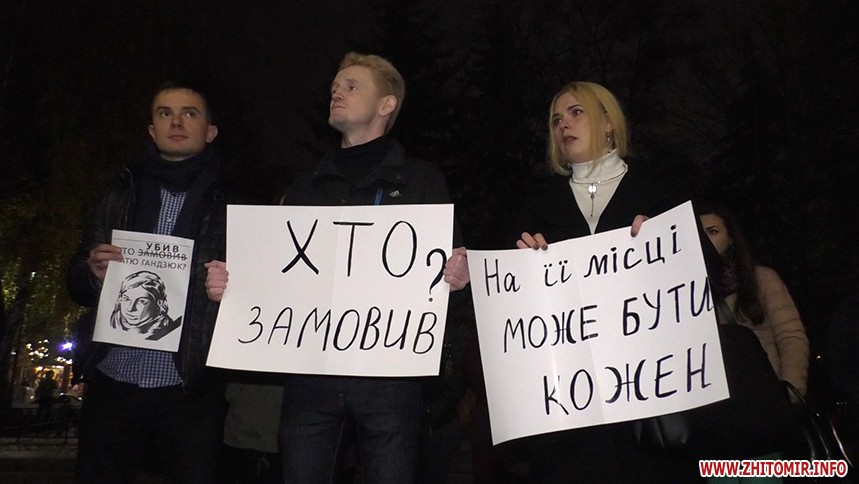 Житомиряни, які прийшли на спонтанний мітинг-реквієм, залишили також і плакати, написані від руки. На папері було написане одне запитання: «Хто вбив Катю Гандзюк?».