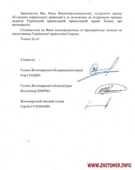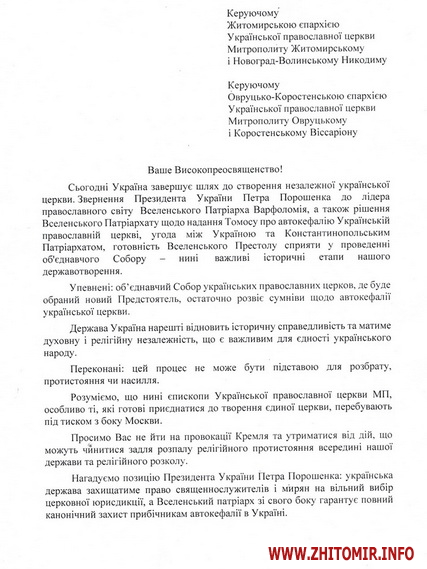 Спільне звернення до керівників єпархій УПЦ МП підписали 20 листопада голова Житомирської ОДА Ігор Гундич, голова обласної ради Володимир Ширма та міський голова Житомира Сергій Сухомлин.