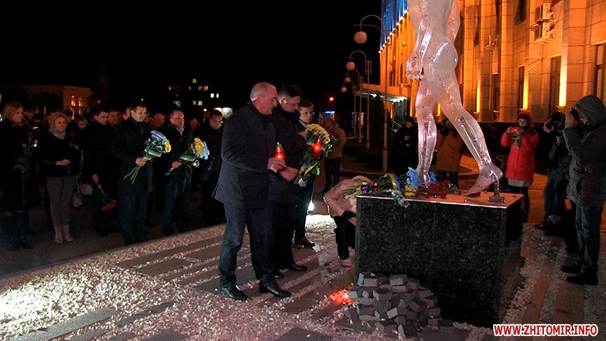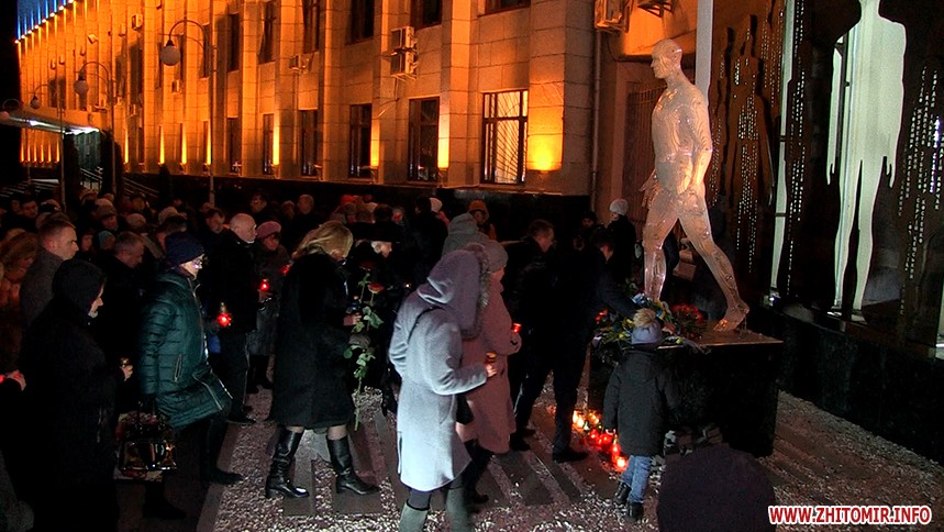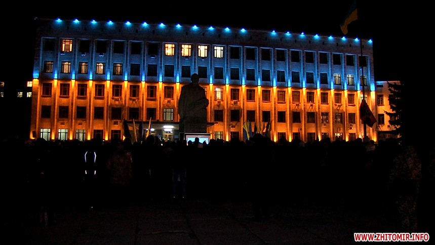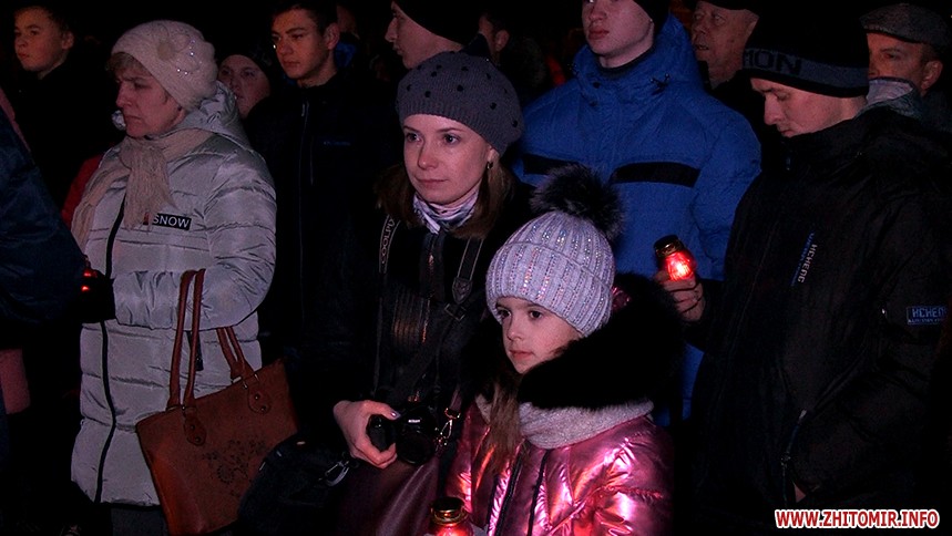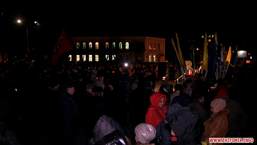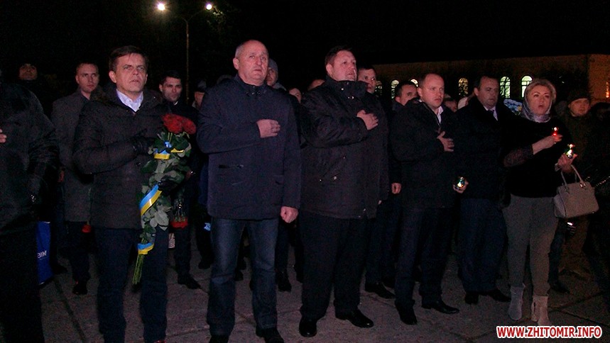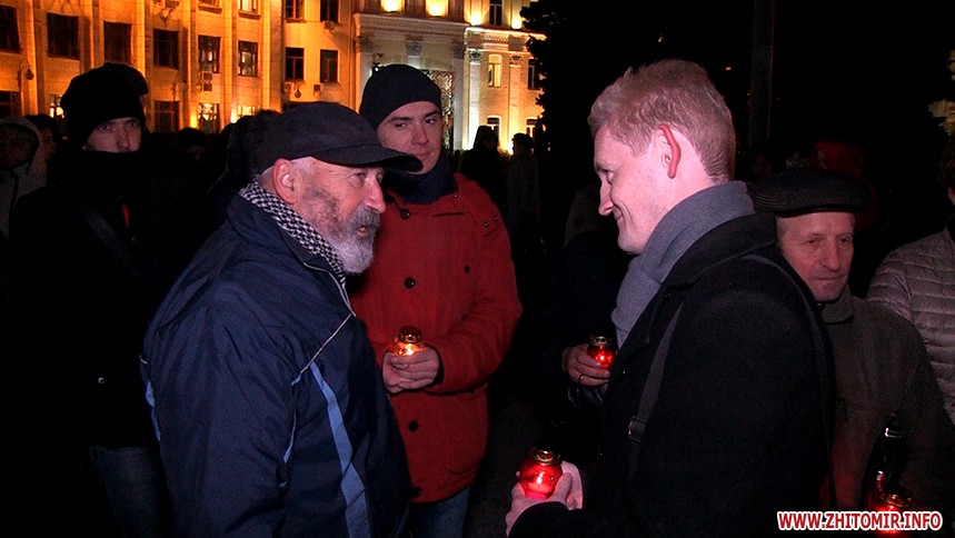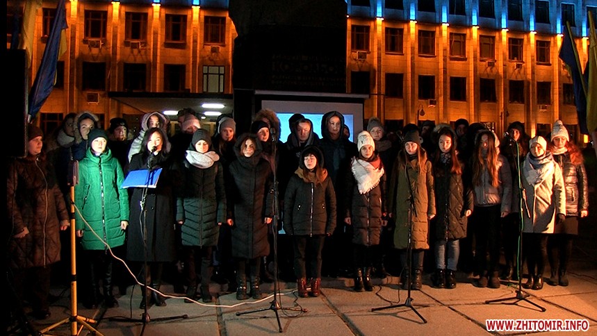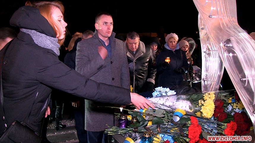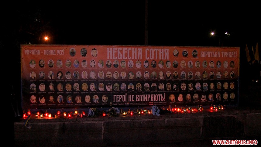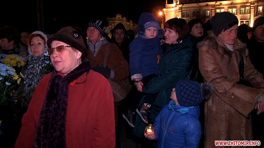 «Слава Україні! - Героям Слава!», - саме з цього вітального гасла у День Гідності та Свободи розпочалося віче пам’яті у Житомирі. Опісля, сотні людей, що прийшли на майдан Корольова, спільно виконали гімн та хвилиною мовчання згадали Героїв, які загинули, відстоюючи єдність та незалежність України.