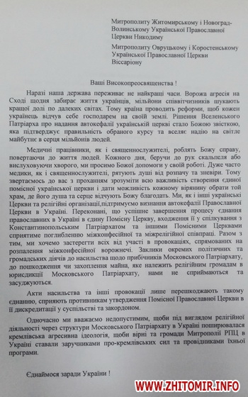 Нагадаємо, спільне звернення щодо створення єдиної православної церкви до керівників єпархій УПЦ МП 20 листопада підписали голова Житомирської ОДА Ігор Гундич, голова обласної ради Володимир Ширма та міський голова Сергій Сухомлин.