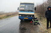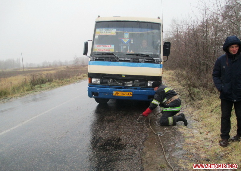 «25 листопада о 09:18 до служби порятунку «101» від водія рейсового автобуса «Еталон» надійшло повідомлення про те, що під час слідування за маршрутом Симони – Житомир, поблизу с. Ясна Поляна Пулинського району, через ожеледицю, транспортний засіб розвернуло і він зупинився поперек дороги. На той момент в салоні перебувало 25 пасажирів. На трасі поступово почав утворюватися затор. На місці пригоди бійці ДСНС за допомогою тросу та пожежного автомобіля відбуксирували автобус на проїжджу частину дороги. Вже далі він зміг продовжити рух самостійно. Ще одна подібна пригода трапилася того ж дня об 11:41 в смт Черняхів. Через ожеледицю рейсовий автобус Малин – Житомир з 20 пасажирами у салоні занесло на узбіччя дороги у кювет. З’єднавши тросом транспортний засіб та автомобіль рятувальників, бійці ДСНС витягнули його на проїжджу частину дороги і він продовжив свій рух далі. На щастя, внаслідок даних пригод ніхто не постраждав», - поінформували в ДСНС.