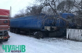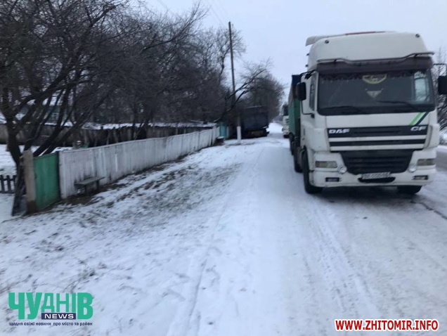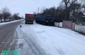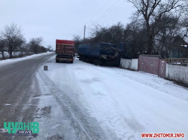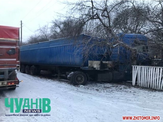 Поблизу села Стовпів, що на трасі з Чуднова до Шепетівки у Житомирській області, вантажівка в’їхала у подвір’я придорожньої хати. Ймовірно, фуру занесло на слизькій дорозі.