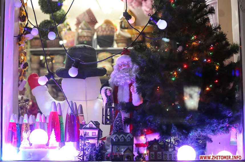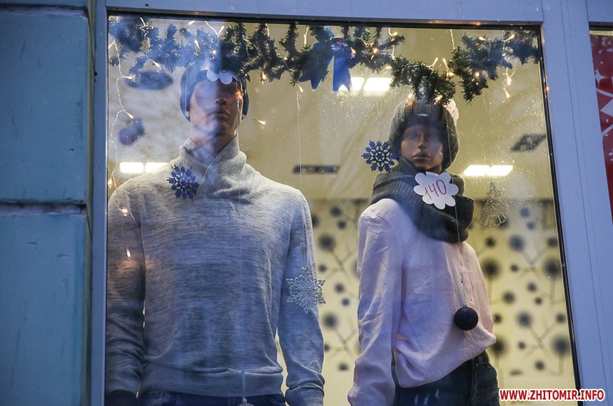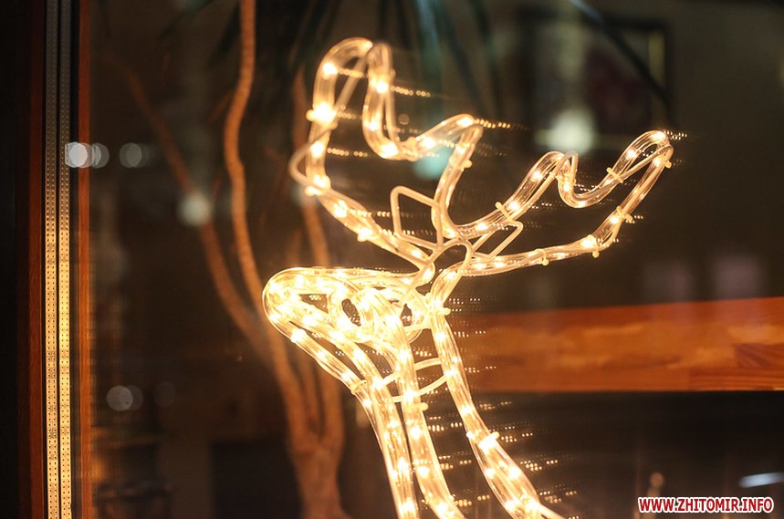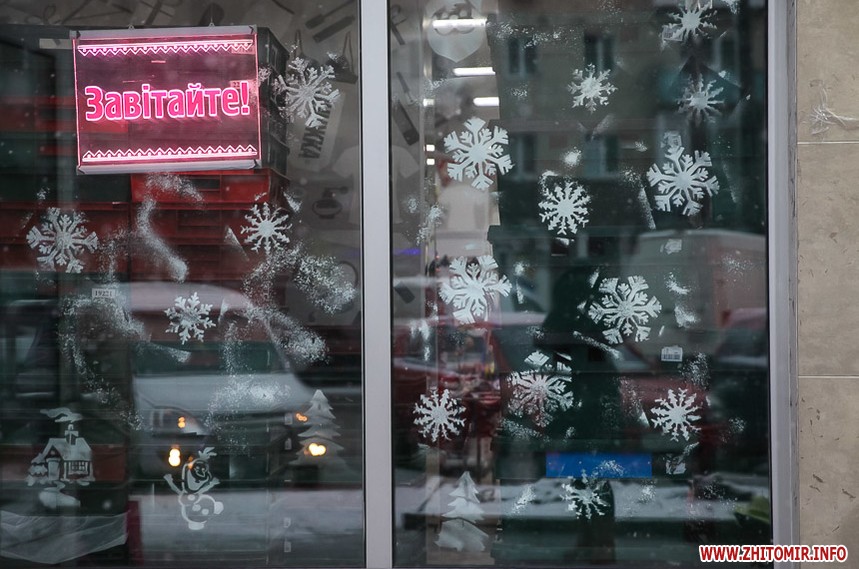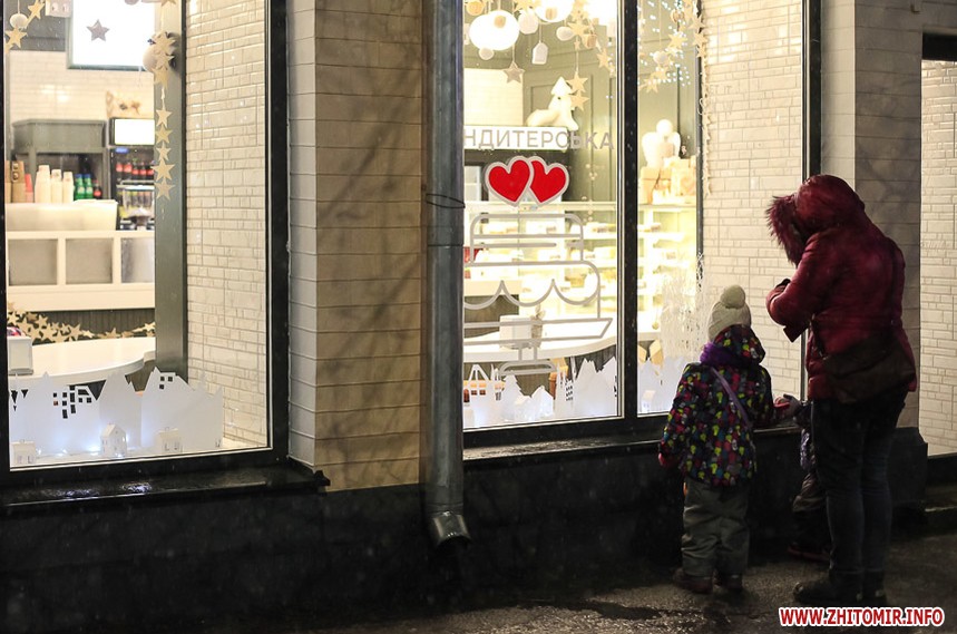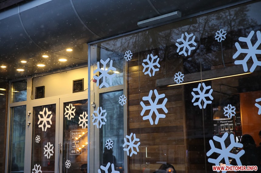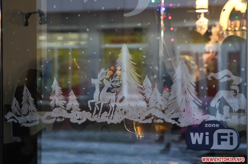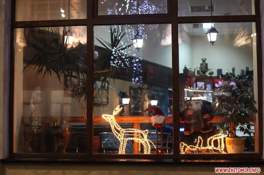 Та особливо святкового настрою житомирським вулицям додають яскраво прикрашені вітрини кафе та магазинів: мереживо білих сніжинок, різнобарвні вогники гирлянд, святково одягнені ялинки, казкові вітражі, сніговики, Діди Морози і Санта Клауси і, звичайно, головний символ прийдешнього року – милі, рожеві поросятка.