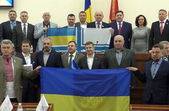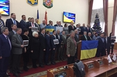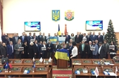 Депутати облради вишикувалися біля президії, тримаючи у руках державний прапор України та стяг Військово-Морських Сил.