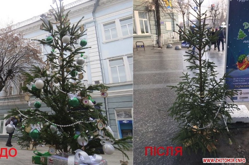 20 грудня житомиряни розповіли Житомир.info, що напередодні увечері запримітити людей, які знімали з новорічних дерев прикраси.