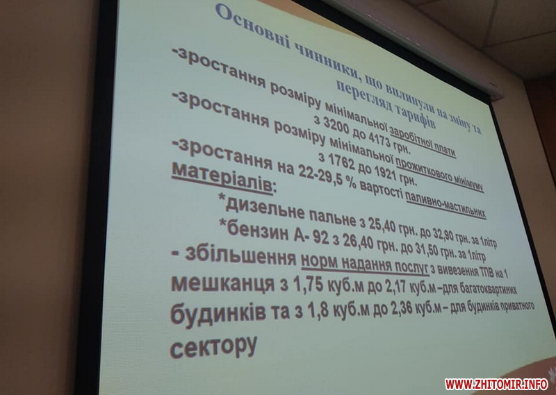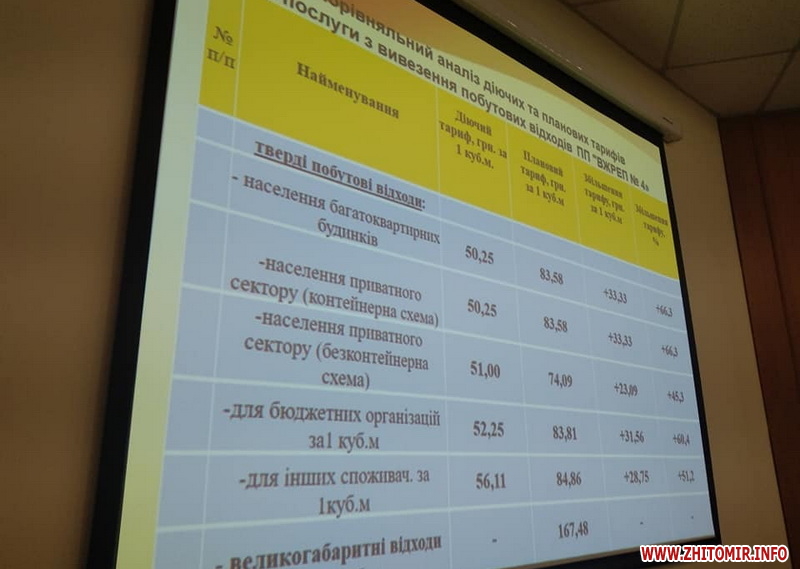 «Тариф зростає на 66%, бо зросла зарплата, вартість палива, змінилися норми накопичення сміття. Крім того, у новий тариф вже закладений вивіз крупногабаритного сміття. Тариф для населення буде 16,17 грн, а було 8 грн. Тобто, вартість зросте на 100%, але хочу відмітити, що наші тарифи нижчі, ніж середні по Україні. Наприклад, у Малині вже давно 30 грн. Ми все одно відстаємо», - пояснив директор ПП «ВЖРЕП №4», депутат міської ради від Опозиційного блоку Володимир Тичина.