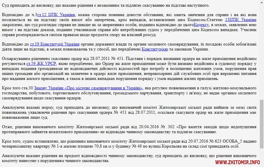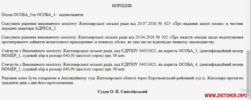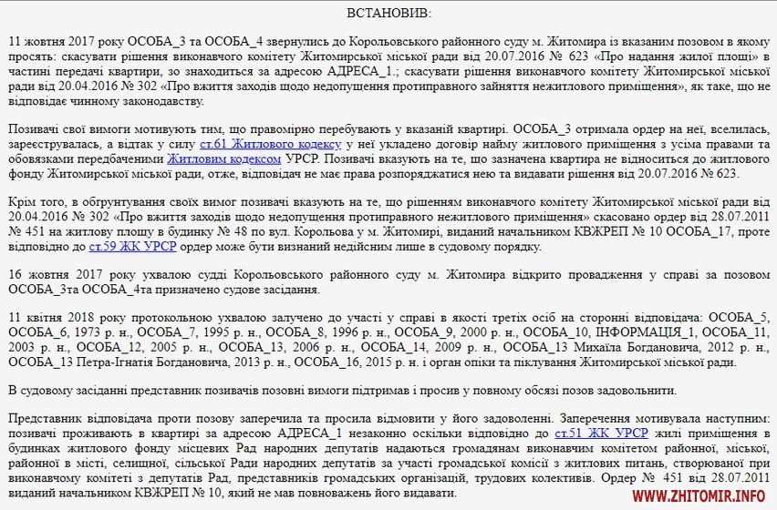 В єдиному державному реєстрі судових рішень є рішення Корольовського райсуду Житомира від 2 жовтня 2018 року, яким було задоволено позов та скасовано рішення виконкому від 2016 року.