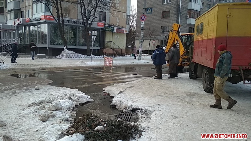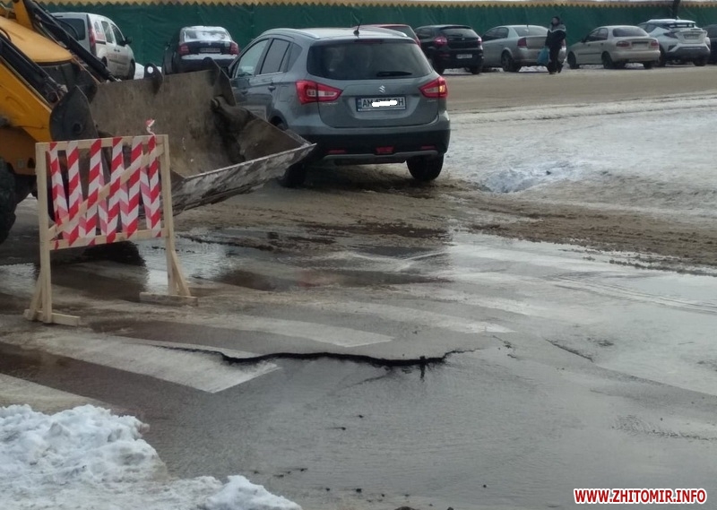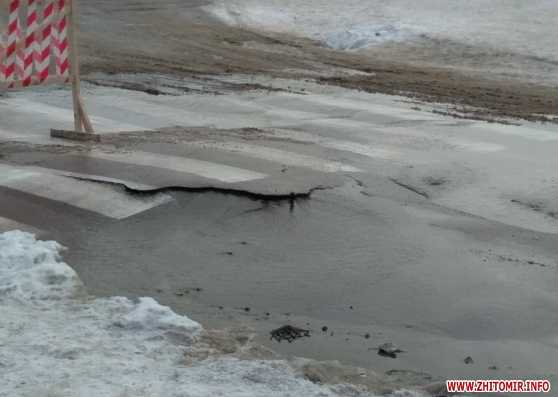 10 січня на перехресті вулиць Лятошинського та Небесної сотні, неподалік Житнього ринку, у Житомирі тріснув асфальт, з-під нього витікає вода.