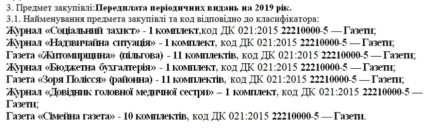 Комунальний заклад «Житомирський обласний спеціалізований будинок дитини для дітей-сиріт та дітей, які залишились без піклування батьків» Житомирської обласної ради збирався витратити на передплату періодики на І півріччя 2019 року 22 тис. 500 грн, але в результаті конкуренції на торгах заплатить 19 тис. 942,1 грн.