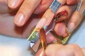 Технология подразумевает использование шёлка, специального клея и активатора для него. Собственные ногти необходимо укоротить, так как к ним будут прикрепляться типсы. Они в последующем укрепляются лоскутками ткани, которые пропитаны клеем.