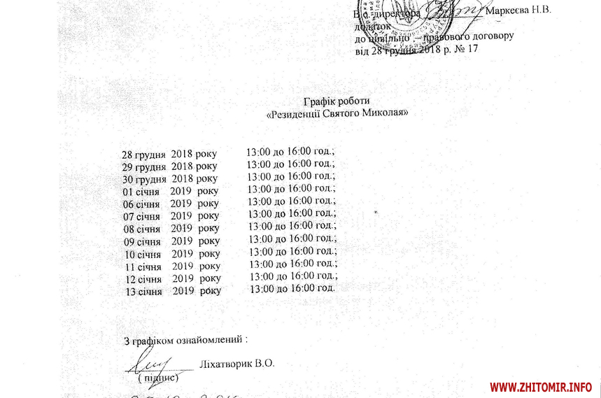Уже 28 грудня 2018 палац культури укладає цивільно-правовий договір з громадянином Ліхотвориком Володимиром Олександровичем про участь в новорічних та різдвяних святах в образі святого Миколая, хоча на «посту» в резиденції новий Миколай був уже 25 грудня.