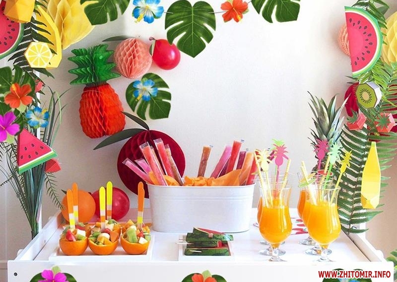 Приміщення слід декорувати кульками з фольги у формі тропічних коктейлів. А пригощати гостей варто вже справжніми напоями, які обов’язково мають містити екзотичні складові. Аби учасники свята почувалися невимушено та не хвилювалися через те, що можуть розбити скляний келих, бажано розливати коктейлі у пластиковий посуд.