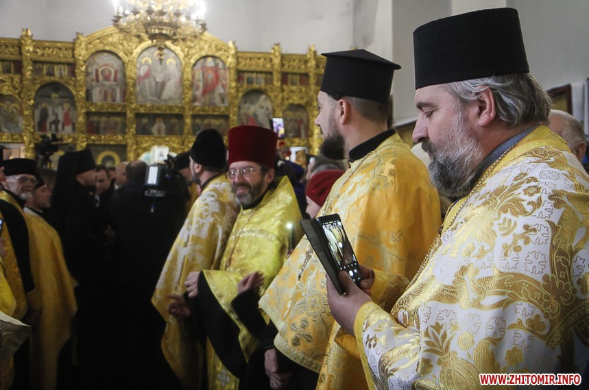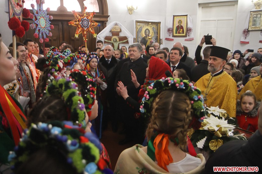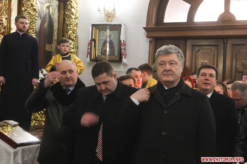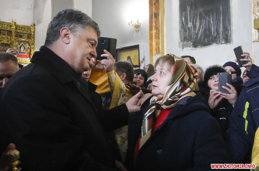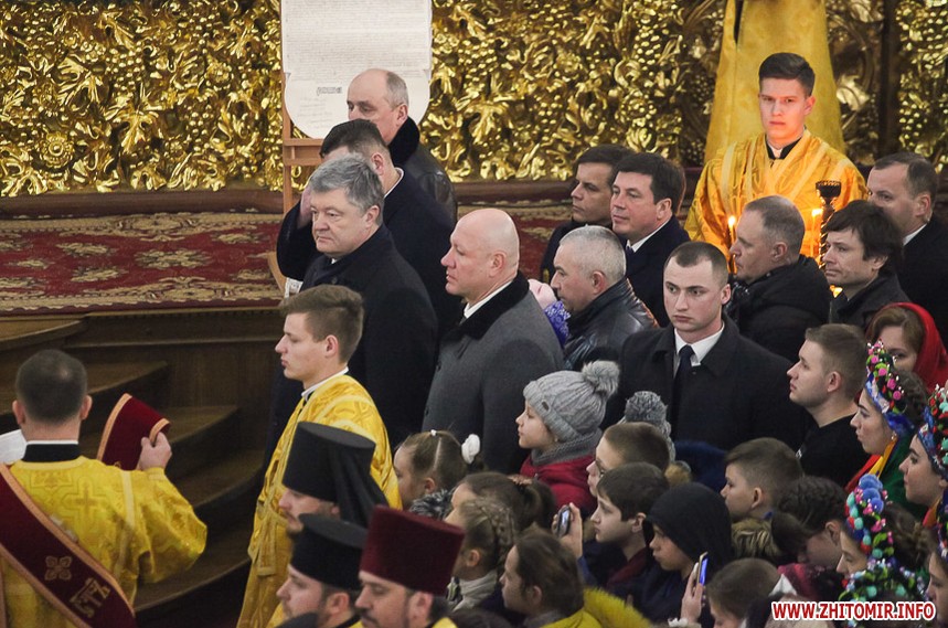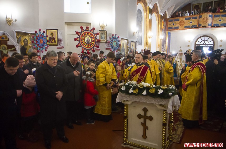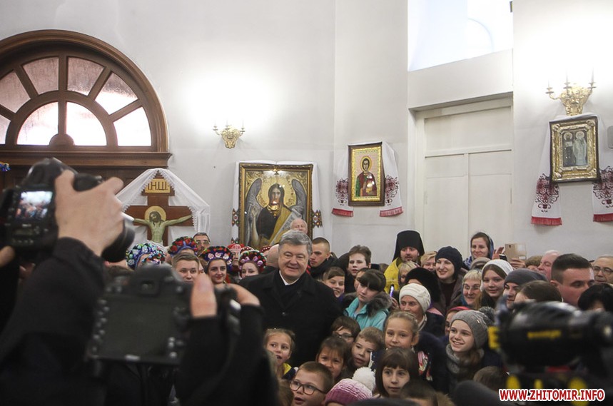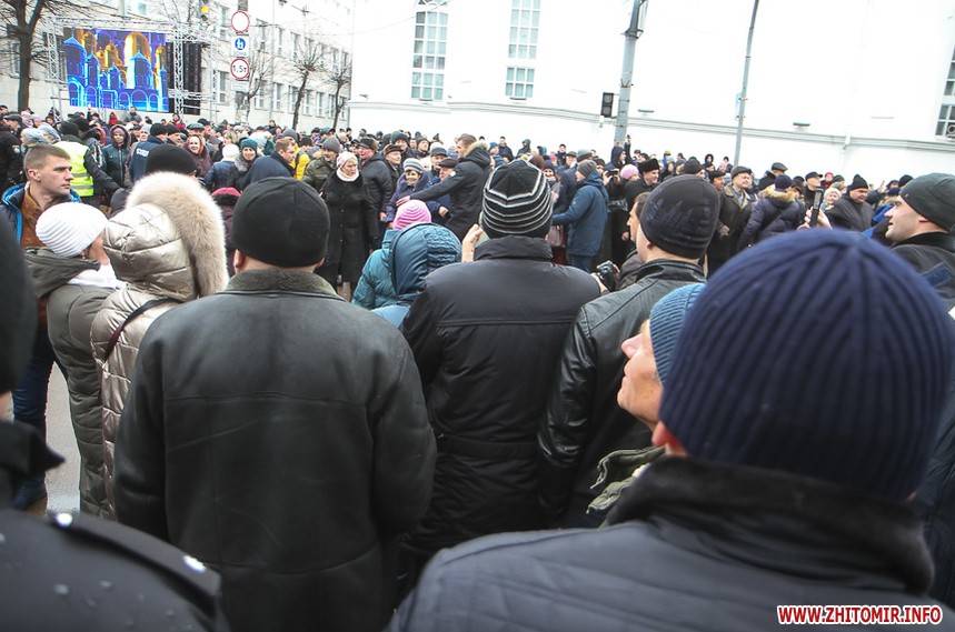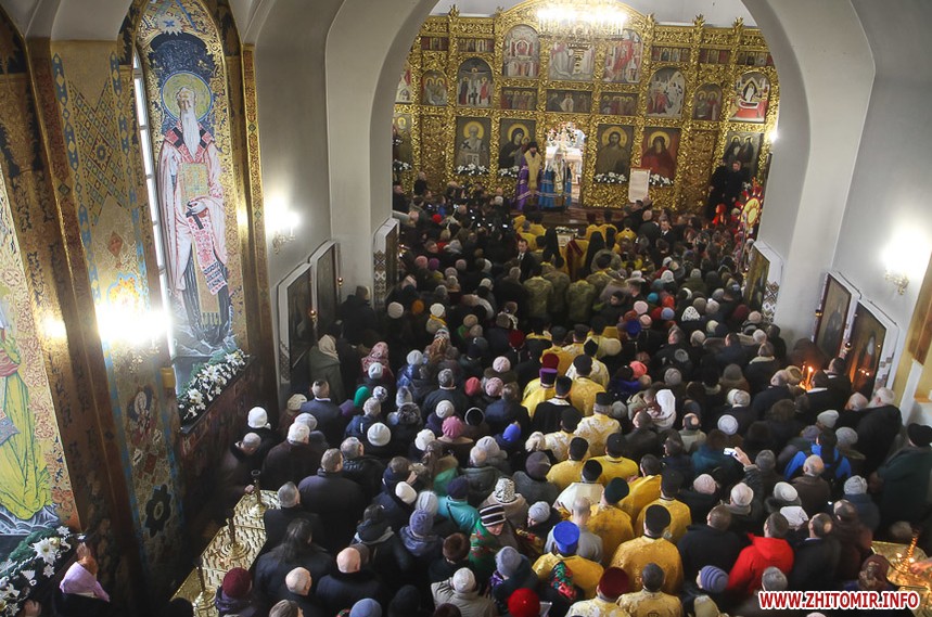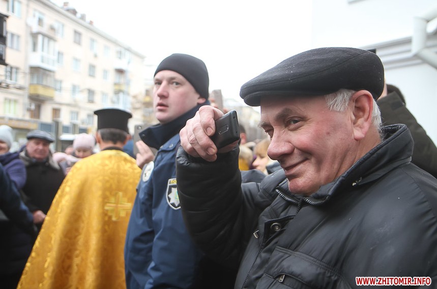 Натовп зібрався біля церкви, заполонивши частину вулиці Київської, де вона межує з Михайлівською. Люди фотографували президента Петра Порошенка, який прибув цього дня до Житомира.