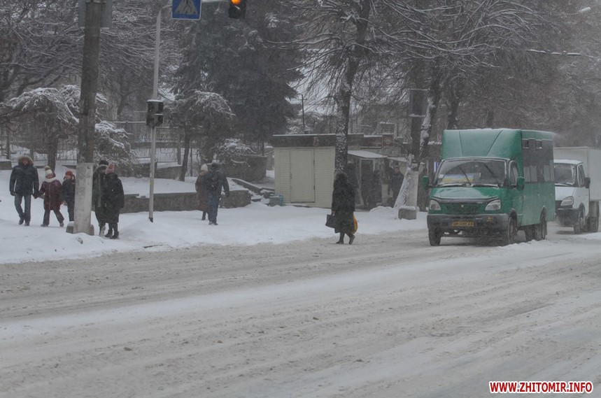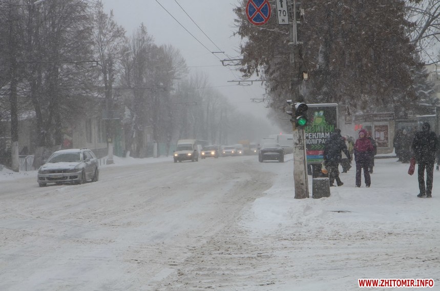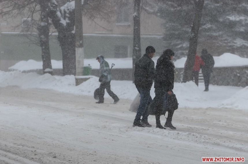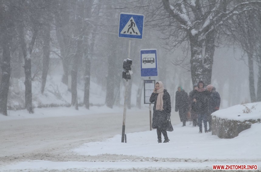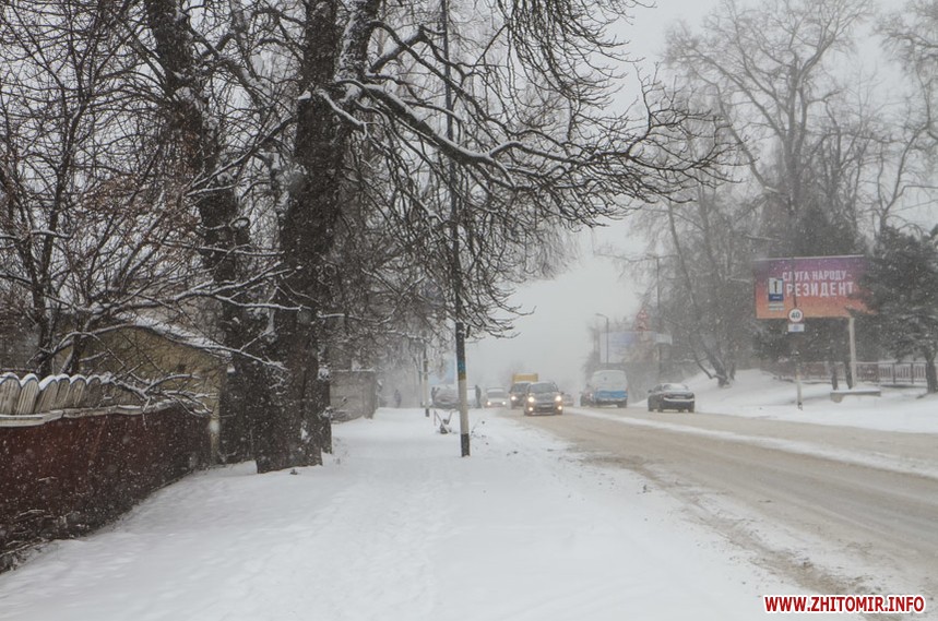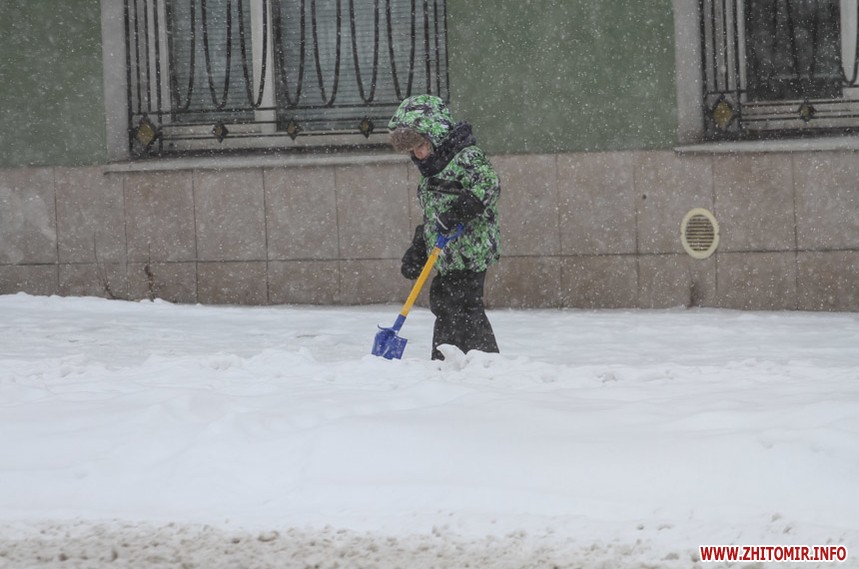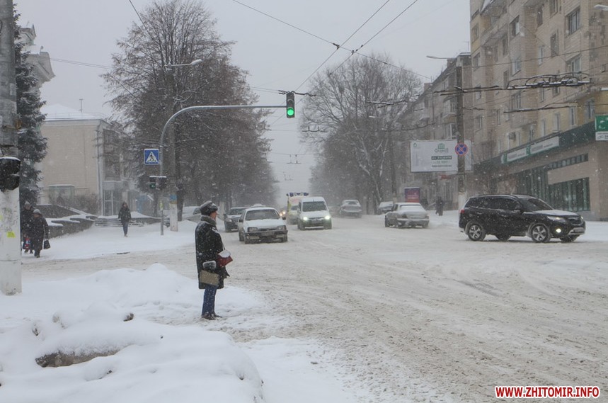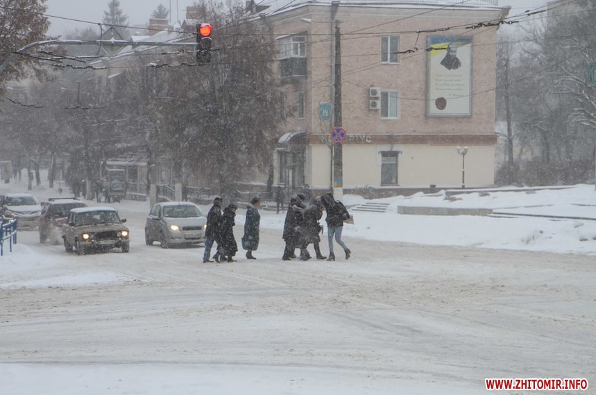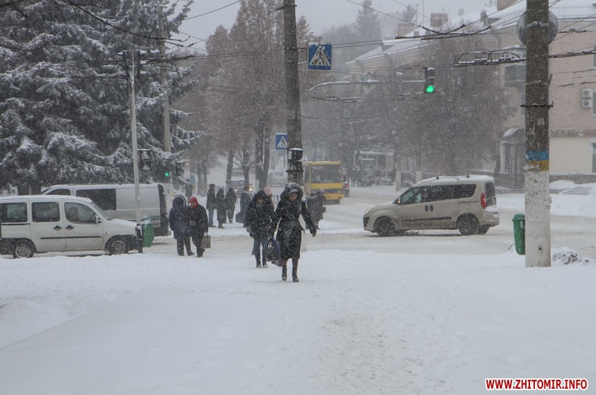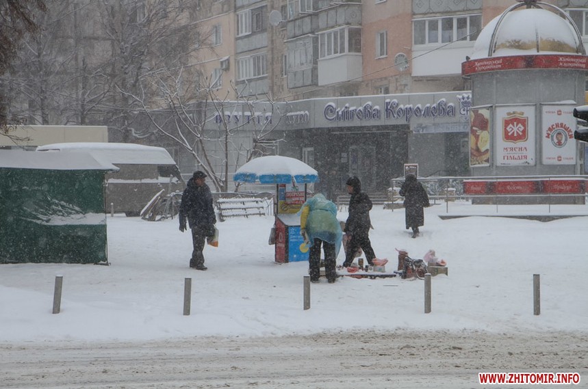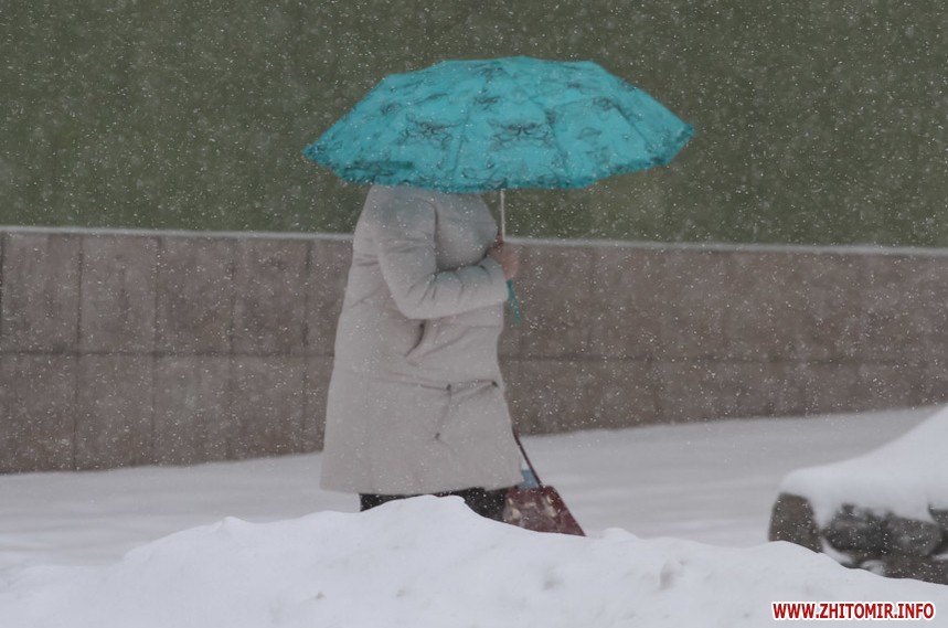 Снігопад у Житомирі, який розпочався в ніч на 23 січня, не вщухає. Деякі з містян захищаються від «білих мух» за допомогою дощовиків і парасольок.