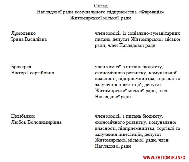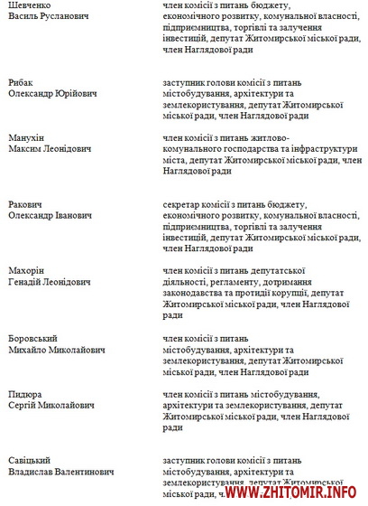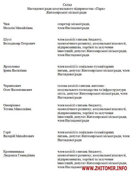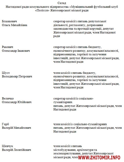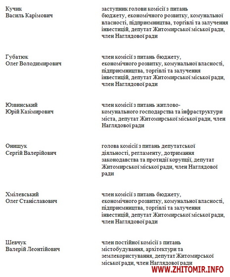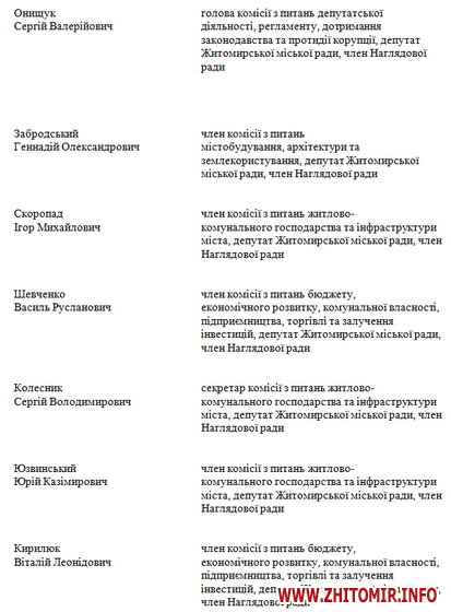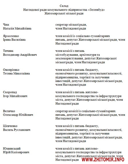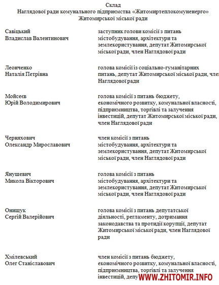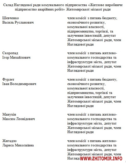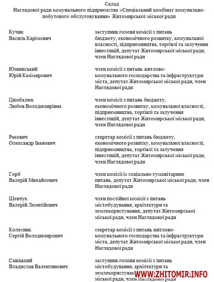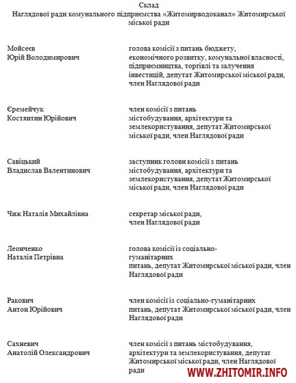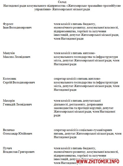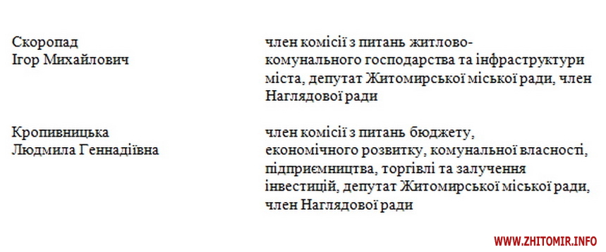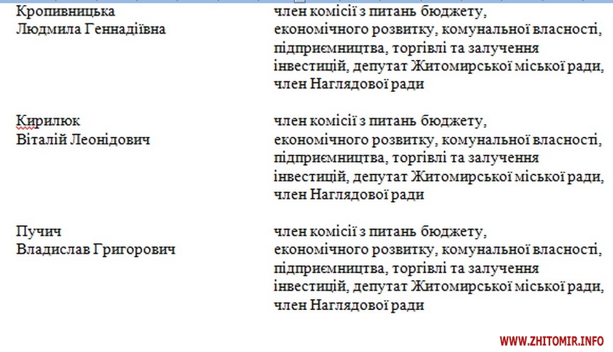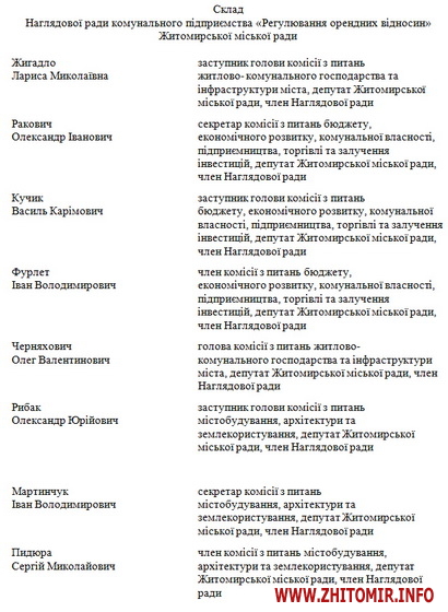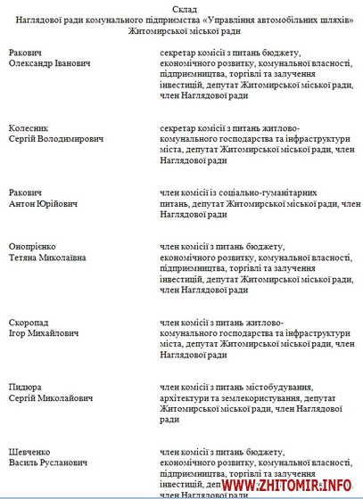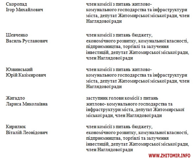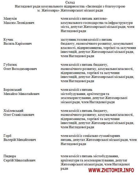 У додатках до проекту – оновлені наглядові ради 12 комунальних підприємств: депутат Владислав Пучич (фракція Блоку Петра Порошенка) став членом наглядових рад КП «Житомирське трамвайно-тролейбусне управління» та КП «Регулювання орендних відносин», Віталій Кирилюк (фракція Об’єднання «Самопоміч») – КП «Житомиртеплокомуненерго», КП «Житомирводоканал» та КП «Регулювання орендних відносин».