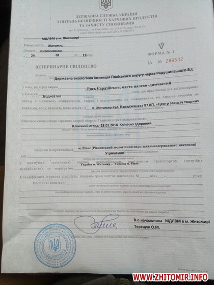 Як повідомляв Житомир.info, 21 січня 2019 року в Житомирі зловили травмовану рись, яка розгулювала гідропарком. Найімовірніше, самця передадуть до Рівненського зоопарку. 22 січня у житомирському Центрі захисту тварин розповіли, як почувається відловлена рись.