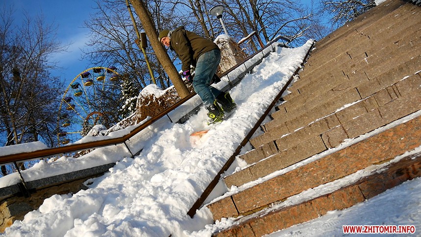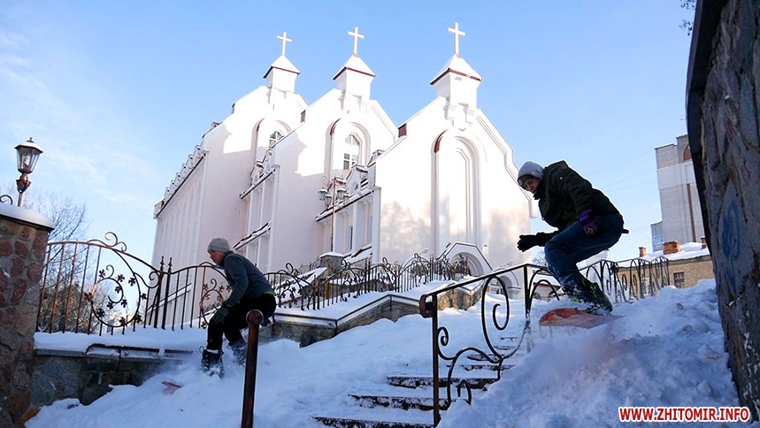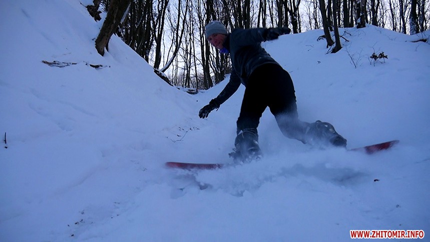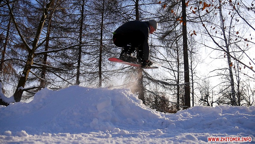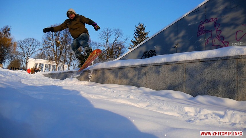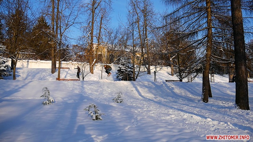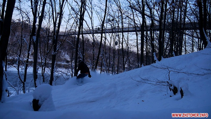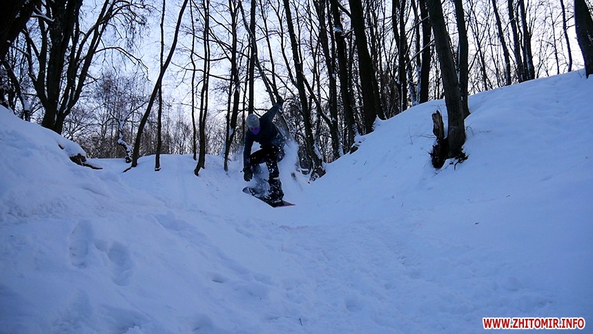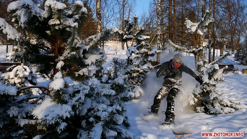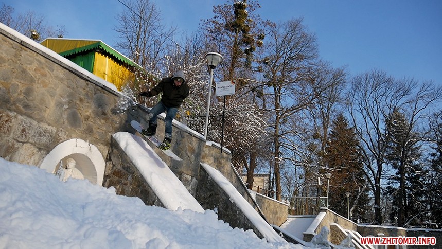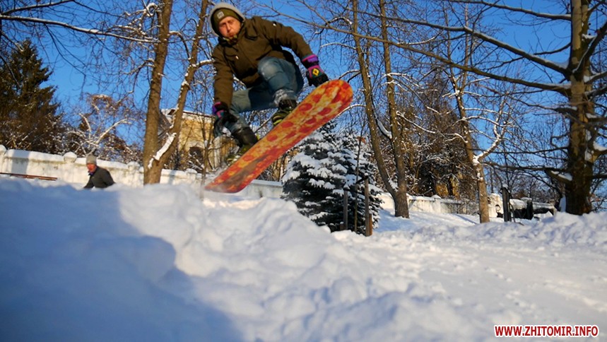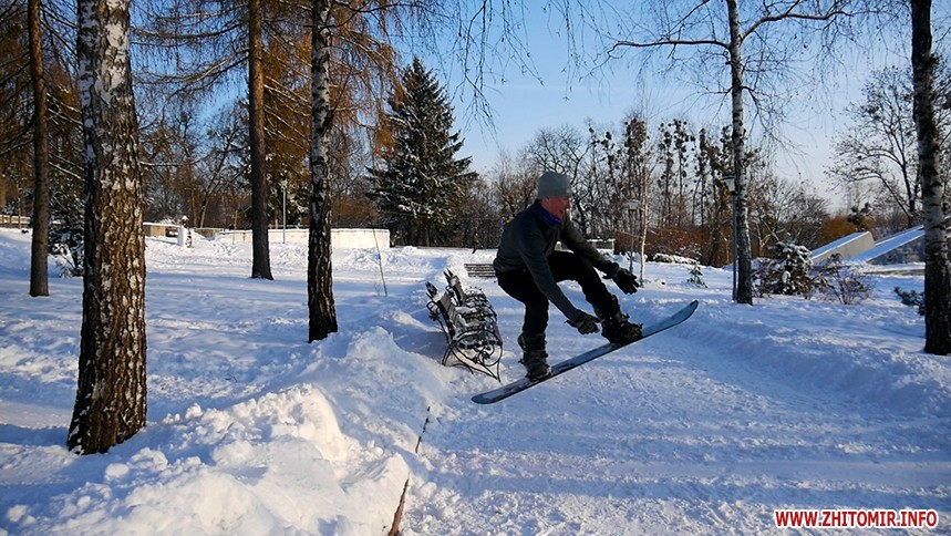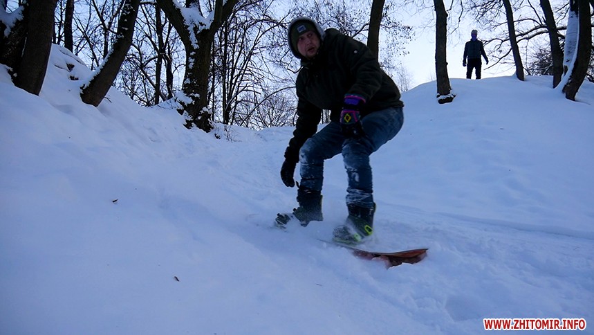 Отож житомиряни Олег Мартинюк та Микола Якубенко 24 січня стали на сноуборди і навіть перетворили частинку парку імені Гагаріна на гірськолижну трасу. Журналісти Житомир.info зустрілись із спортсменами та пройшли із ними маршрут, який сноубордисти створили на схилах річки Тетерів.