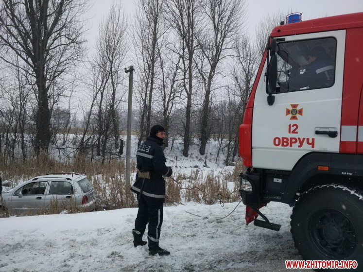 Вранці 26 січня на трасі Виступовичі-Житомир поблизу міста Овруч легковий автомобіль опинився в кюветі. Машину довелось діставати рятувальникам.