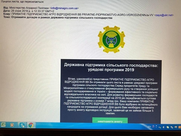 «Останнім часом від суб'єктів господарювання надходить інформація про випадки надсилання підозрілих листів від імені Міністерства аграрної політики та продовольства України. Повідомлення надходять з фіктивної адреси info@minagro.com.ua з темою «Отримайте дотацію в рамках державна підтримка сільського господарства», - інформує міністерство.