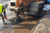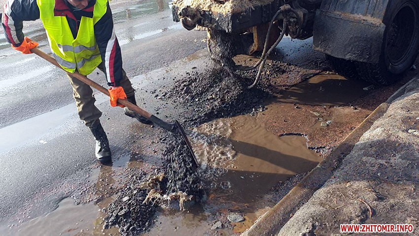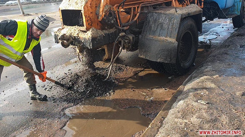 На вулиці Великій Бердичівській у Житомирі 4 лютого комунальники підсипали ями, які через плюсову температуру та сніготанення заповнені водою.