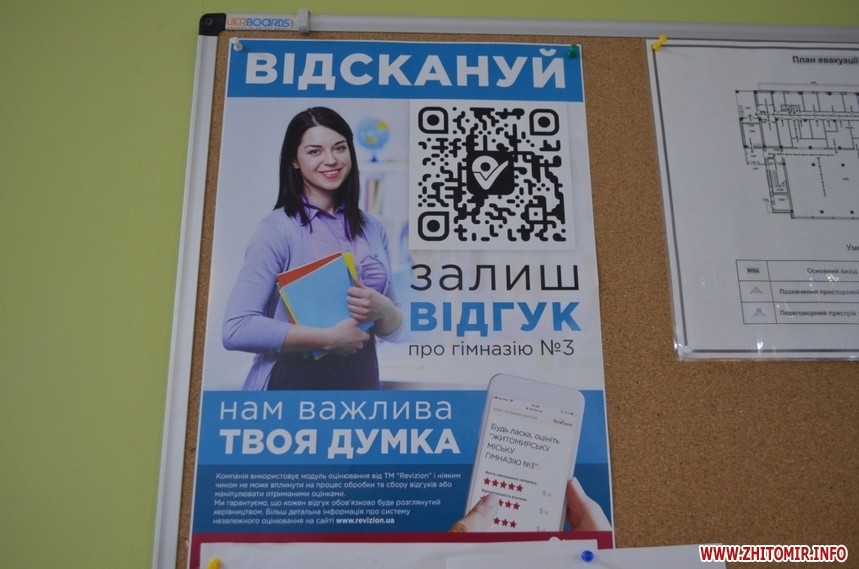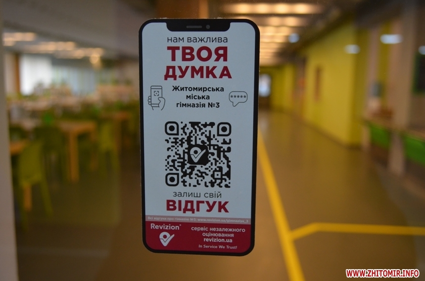 Він зазначив, що залишити свій відгук можна, відсканувавши QR-код або перейшовши за коротким посиланням з яскравих фірмових наліпок Revizion. Знайти їх можна у вестибюлях житомирських шкіл та садочків, - зазначає міськрада.