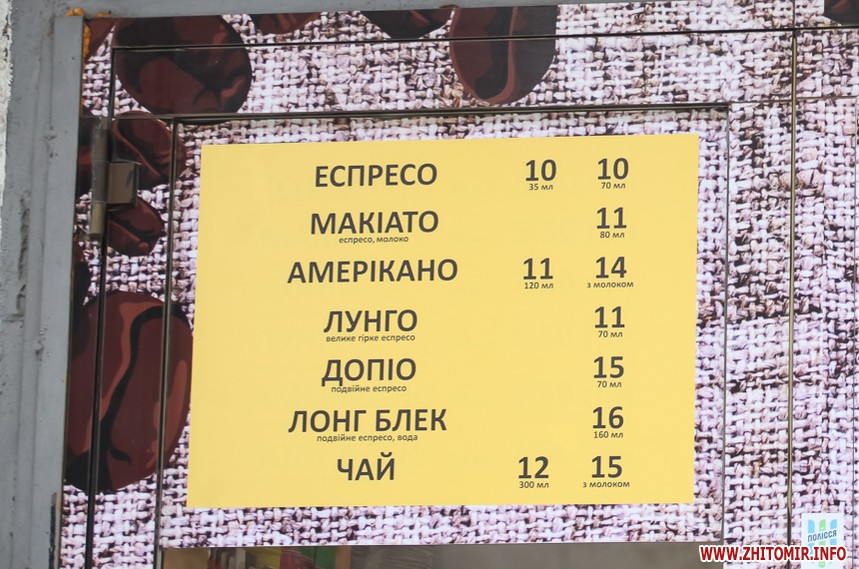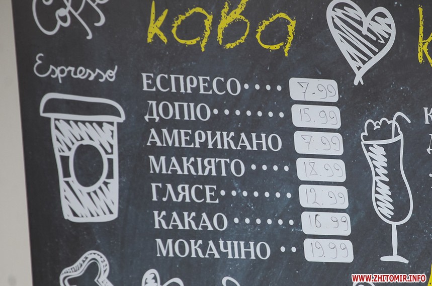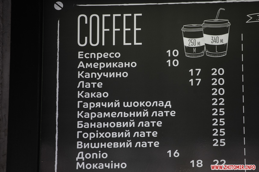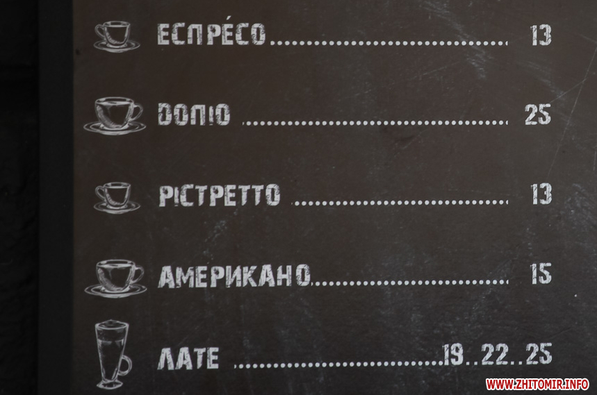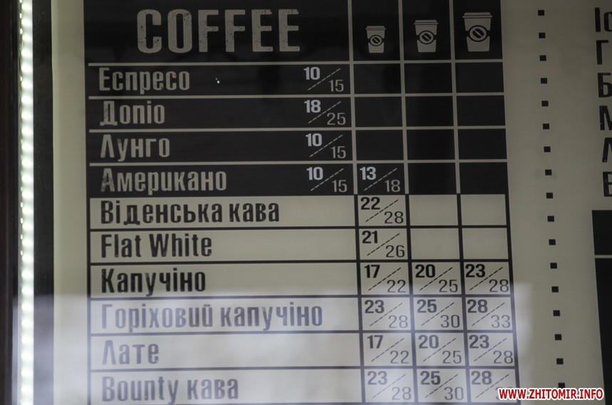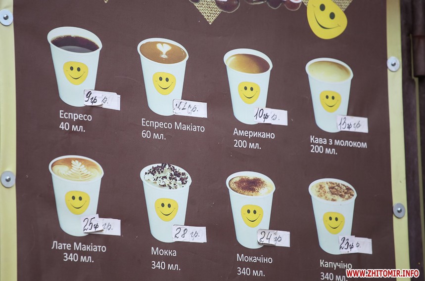 Наприкінці січня 2018 року у більшості закладів в центрі Житомира еспресо коштувало 8 грн, американо – 9 грн. Найдорожчим було капучино з наповнювачами – 29 грн.