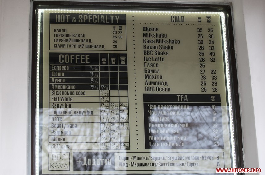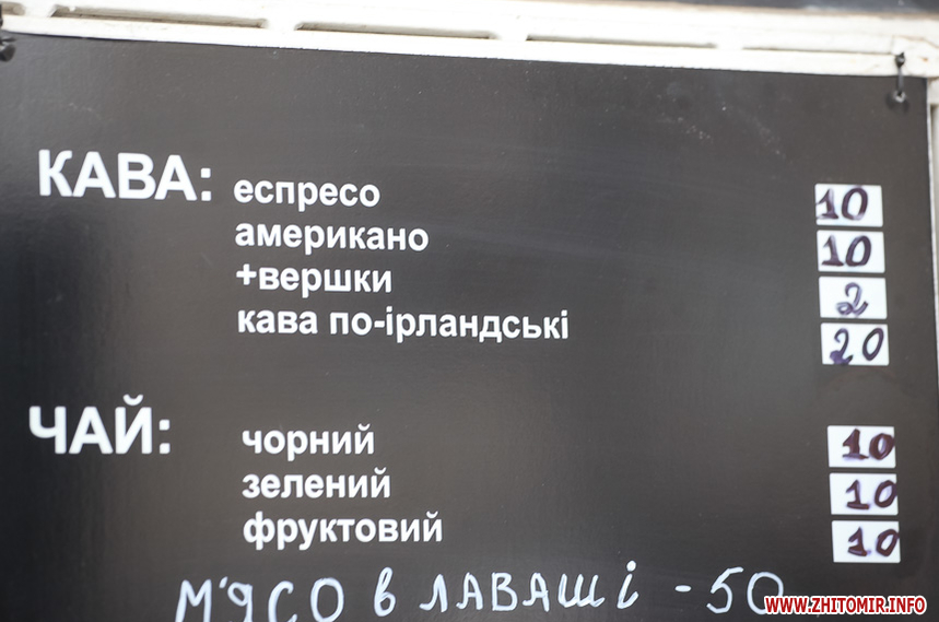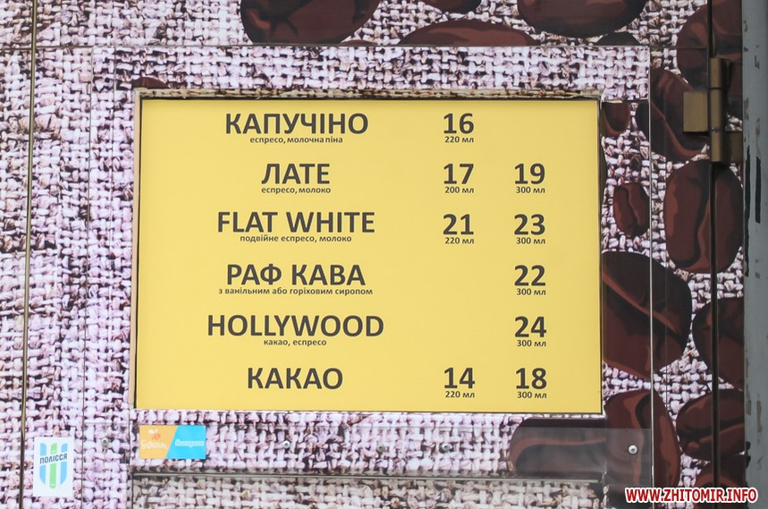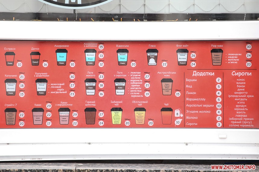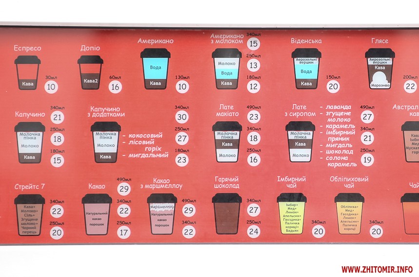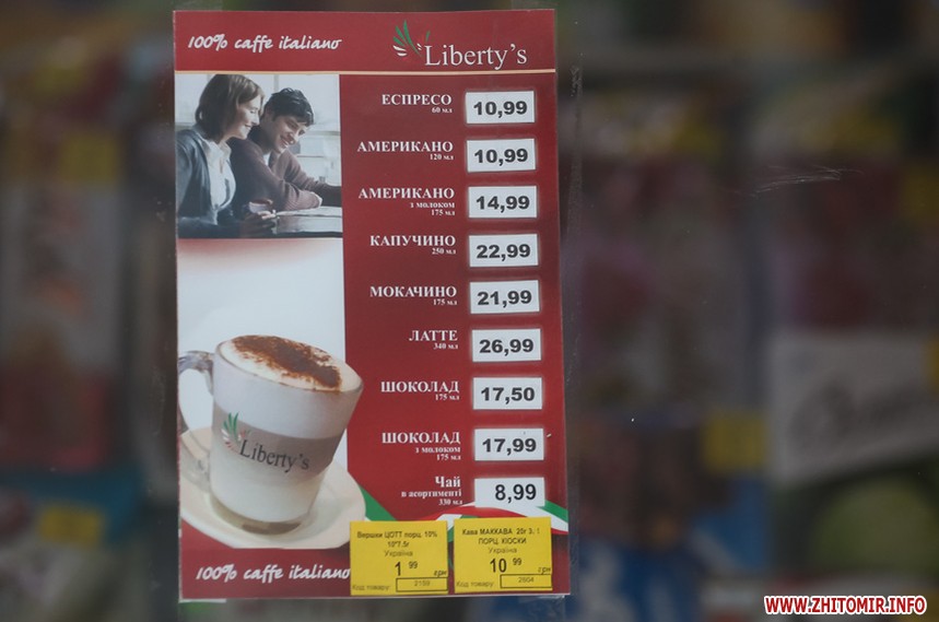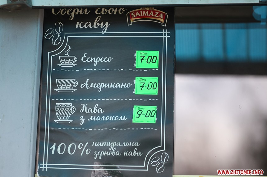 Наприкінці січня 2018 року у більшості закладів в центрі Житомира еспресо коштувало 8 грн, американо – 9 грн. Найдорожчим було капучино з наповнювачами – 29 грн.